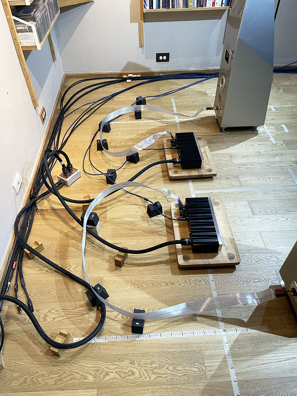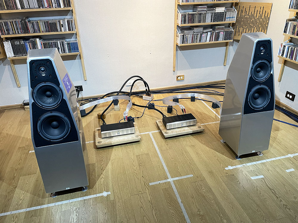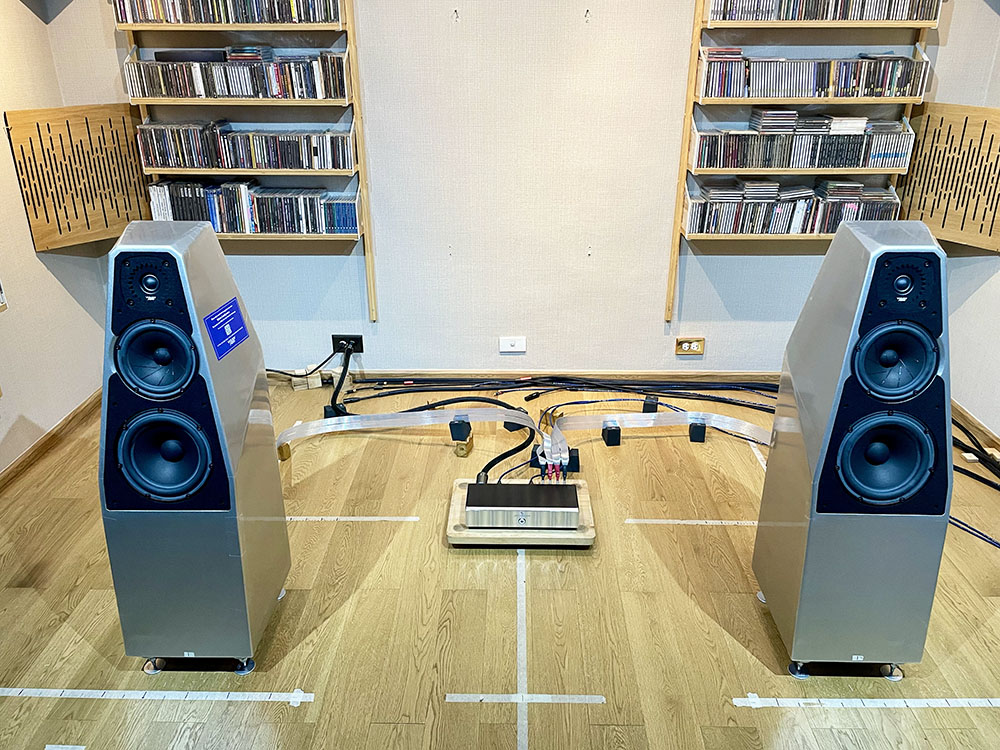 ในภาพข้างบนเป็นตอนที่ผมเซ็ตอัพด้วยการใช้เพาเวอร์แอมป์ Model 125 พร้อมกัน 2 ตัว ทำงานในโหมด Bridge Mono ทำให้กำลังขับของแต่ละข้างขยับเพิ่มขึ้นไปเป็น 500W ต่อข้างที่โหลด 4 โอห์ม เพิ่มขึ้นจากเดิมข้างละ 5 เท่า.!! เสียงที่ออกมาเปลี่ยนแปลงไปอย่างสิ้นเชิง ที่ชัดเจนมากที่สุดก็คือว่าแต่ละเสียงมีความสด เหมือนจริงมากขึ้น มูพเม้นต์ของเสียงของเครื่องดนตรีแต่ละชิ้นมีความกระชับเร็วและเน้นน้ำหนักขึ้นมาก อาการนุ่มๆ ที่เกาะติดอยู่กับเสียงในย่านทุ้มหายไป กลายเป็นเสียงทุ้มที่มีความทะมัดทะแมง เคลื่อนไหวด้วยความฉับไว หัวเสียงมีน้ำหนักย้ำเน้นมากขึ้น ตัวเสียงมีความตึงตัวของเนื้อเสียงมากขึ้น เหมือนนักกีฬาที่มีมัดกล้าม ไร้ไขมัน ซึ่งส่งผลถึงไดนามิกที่มีอัตราสวิงที่เปิดกว้างมากขึ้น ช่วงเบาสุด กับช่วงดังสุด (peak) มีระยะห่างกันมากขึ้น แต่ใช้เวลาสวิงจากเบาสุดไปดังสุดสั้นลง นั่นคือทรานเชี้ยนต์ของไดนามิกคมมากขึ้น ช่องไฟระหว่างแต่ละเสียงมีความโปร่งใสมากขึ้น ทำให้แยกแยะเสียงแต่ละเสียงออกจากกันได้ง่ายขึ้น สรุปคือเสียงโดยรวมเปลี่ยนไปเยอะมาก.!!