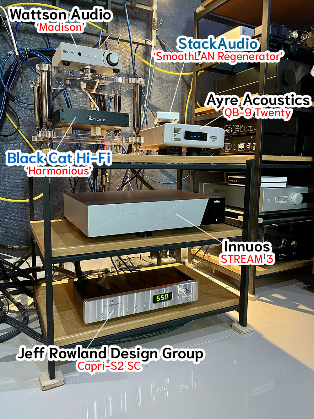 *แหล่งต้นทางสัญญาณ (source) ที่ทำงานอยู่เคียงข้าง MODEL 555 สำหรับการทดสอบครั้งนี้ก็มี Innuos รุ่น STREAM 3 ทำหน้าที่เป็นสตรีมมิ่ง ทรานสปอร์ต ดึงไฟล์และอ่านไฟล์เพลงที่สตรีมฯ มาจาก TIDAL และไฟล์เพลงที่สตรีมฯ มาจาก NAS โดยมี Wattson Audio ‘Madison’ (เสียบพ่วงด้วยกราวนด์บ็อกของ Black Cat Hi-Fi รุ่น Harmonious โดยที่ทั้งคู่วางอยู่บนมินิแร็คของ Tombo Audio ที่ช่วยลดแรงสั่นสะเทือน) กับ Ayre Acoustics ‘QB-9 Twenty’ สลับกันทำหน้าที่เป็น Streamer/DAC และ USB-DAC ซึ่งในบางครั้งผมก็ใช้ระบบวอลลุ่มของ Madison ในการควบคุมความดัง โดยต่อสัญญาณ analog out (XLR) จาก Madison ตรงเข้าไปที่อินพุต XLR ของ MODEL 555 แต่ตอนที่เปลี่ยนมาใช้ QB-9 Twenty ทำหน้าที่เป็น USB-DAC ผมก็จะเสริมปรีแอมป์ Jeff Rowland Design Group รุ่น Capri-S2 SC (REVIEW) เข้ามาในระบบโดยใช้รองรับสัญญาณอะนาลอก เอ๊าต์พุตจาก QB-9 Twenty เข้ามาใช้ภาควอลลุ่มของปรีแอมป์ Capri-S2 SC ก่อนจะต่อเชื่อมเอ๊าต์พุตอะนาลอก XLR จากปรีแอมป์ไปที่อินพุตอะนาลอก XLR ของตัว MODEL 555 โดยที่สายสัญญาณทั้งหมดเป็นของ Nordost รุ่น Blue Heaven ส่วนสายลำโพงเป็นของ Nordost เหมือนกันแต่เป็นรุ่น Tyr2