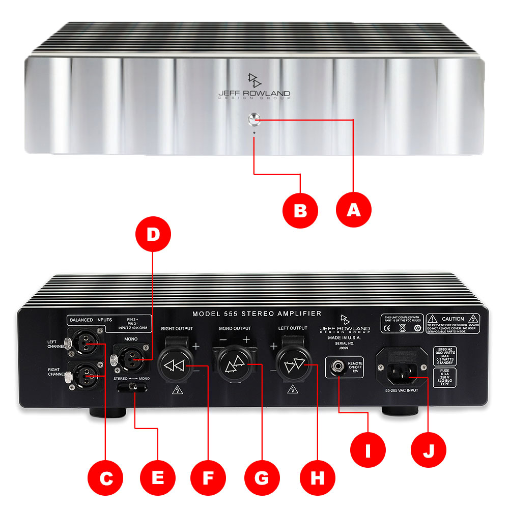 ส่วนช่องต่อสัญญาณขาเข้าและขาออกทั้งหมด ถูกติดตั้งอยู่บนแผงด้านหลัง ซึ่งโดยพื้นฐานของ MODEL 555 ที่เป็นเพาเวอร์แอมป์แบบ pure analog ร้อยเปอร์เซ็นต์ ไม่มีการทำงานของวงจรดิจิตัลอยู่ในตัว และด้วยรูปแบบการดีไซน์วงจรภายในเป็นแบบ fully balanced differenctial ที่แผงหลังของ MODEL 555 จึงมีแต่ขั้วต่อสายสัญญาณแบบบาลานซ์ผ่านขั้วต่อ XLR เท่านั้น แต่แยกเป็น 2 ชุด ให้เลือกใช้ ชุดแรก (C) สำหรับเชื่อมต่อกับสัญญาณที่อยู่ในรูปของสัญญาณอะนาลอก สเตริโอที่ส่งมาจากปรีแอมป์ ส่วนชุดที่สอง (D) สำหรับเชื่อมต่อกับสัญญาณอะนาลอก โมโนที่ส่งมาจากปรีแอมป์ หลังจากปรับให้ MODEL 555 ทำงานในโหมด Mono ด้วยการสับสวิทช์ (E) ไปที่ตำแหน่งโมโนซึ่งเป็นการบริดจ์ฯ ให้ MODEL 555 ทำงานในโหมดโมโนนั่นเอง