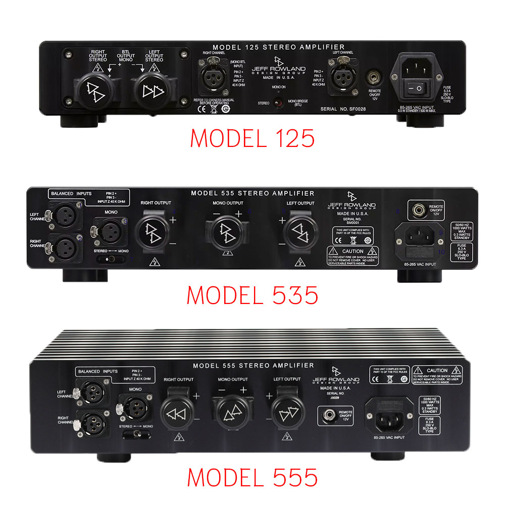 อ้างอิงจากข้อมูลในอ๊อฟฟิเชี่ยลเว็บไซต์ของ Jeff Rowland Design Group เอง พบว่าปัจจุบันพวกเขามีผลิตภัณฑ์ที่เป็น “เพาเวอร์แอมป์” อยู่ทั้งหมด 6 รุ่น คือ MODEL 925, MODEL 825, MODEL 735, MODEL 625 S2, MODEL 535 และ MODEL 125 ซึ่งรุ่นท็อป โมเดล 925 กับรุ่นรองท็อป โมเดล 825 และรุ่นเล็กสุด โมเดล 125 กับรุ่นใหญ่กว่าเล็กสุดขึ้นมาหนึ่งขั้นคือ โมเดล 535 ทั้ง 4 รุ่นนี้ใช้ภาคขยาย class-D ที่แอดวานซ์มากๆ ในขณะที่อีก 2 รุ่นที่เหลือคือ โมเดล 735 กับรุ่น โมเดล 625 S2 นั้นเป็นเพาเวอร์แอมป์ที่ใช้วงจรขยาย class-AB