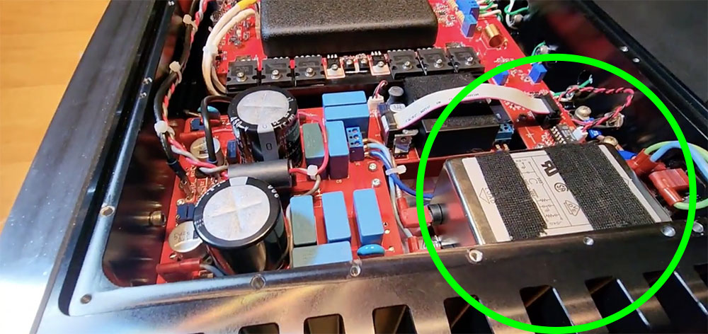 ภาคจ่ายไฟแบบ SMPS ที่ใช้ในรุ่น MODEL 555 มาพร้อมเทคโนโลยีใหม่ๆ ที่ทำให้สามารถสร้างไฟเลี้ยงที่มากพอต่อความต้องการใช้งานในแต่ละเสี้ยววินาทีได้อย่างแม่นยำ ด้วยการแปลงไฟ AC ไปเป็นไฟ DC ที่ระดับความถี่สูงถึง 40,000 เฮิร์ต ซึ่งเป็นไฟ DC ที่มีความเสถียรสูงกว่าภาคจ่ายไฟแบบลิเนียร์ซะอีก และเพื่อให้ไฟเลี้ยง (DC) ที่ได้จากภาคจ่ายไฟ SMPS มีความบริสุทธิ์ปราศจาก noise พวกเขาจึงได้ออกแบบวงจรฟิลเตอร์ EMI ขนาดใหญ่ (ในวงกลมสีเขียว ภาพข้างบน) มาใช้กรองสัญญาณรบกวนตั้งแต่เต้ารับไฟเอซี และยังได้ออกแบบวงจร ‘active power factor correction’ ขึ้นมาเพื่อช่วยทำหน้าที่ปรับปริมาณไฟเลี้ยงให้เหมาะสมกับความต้องการของภาคขยายตลอดเวลาด้วย