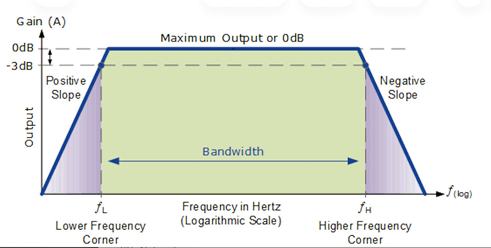 ดูจากรูปข้างบน จะเห็นว่า ปริมาณของเอ๊าต์พุต (กำลังขับ หรือ Gain) ของแอมป์ตัวหนึ่งในระดับเต็มที่ร้อยเปอร์เซ็นต์ คือ 0dB จะเกิดขึ้นเมื่อ Bandwidth หรือ ความถี่ตอบสนอง (พื้นที่สีเขียวในภาพ) ไม่กว้างออกไปมากกว่าเร้นจ์ความถี่ fL ถึง fH ในที่นี้ สมมุติว่า fL = 20Hz ส่วน fH = 20kHz กรณีนี้ ถ้าเราถ่าง Bandwidth หรือความถี่ตอบสนองของแอมป์ตัวนี้ให้ “กว้างกว่า” 20Hz – 20kHz ออกไป สมมุติว่าเป็น 5Hz – 70kHz จะมีผลให้ Gain หรือกำลังขับของแอมป์ลดต่ำลง ถ้าต้องการให้ได้ Gain ของแอมป์สูงขึ้น ก็ต้องลด “ความถี่ความสนอง” หรือ Bandwidth ของแอมป์ให้แคบลง