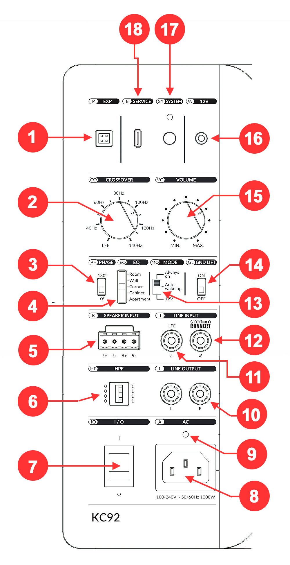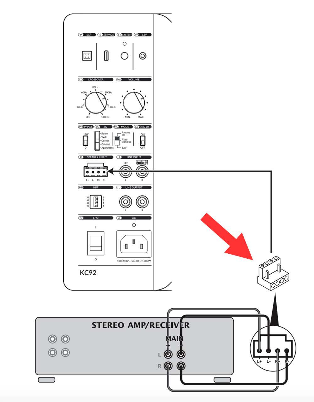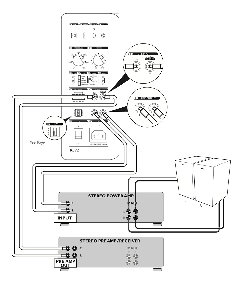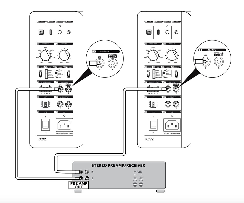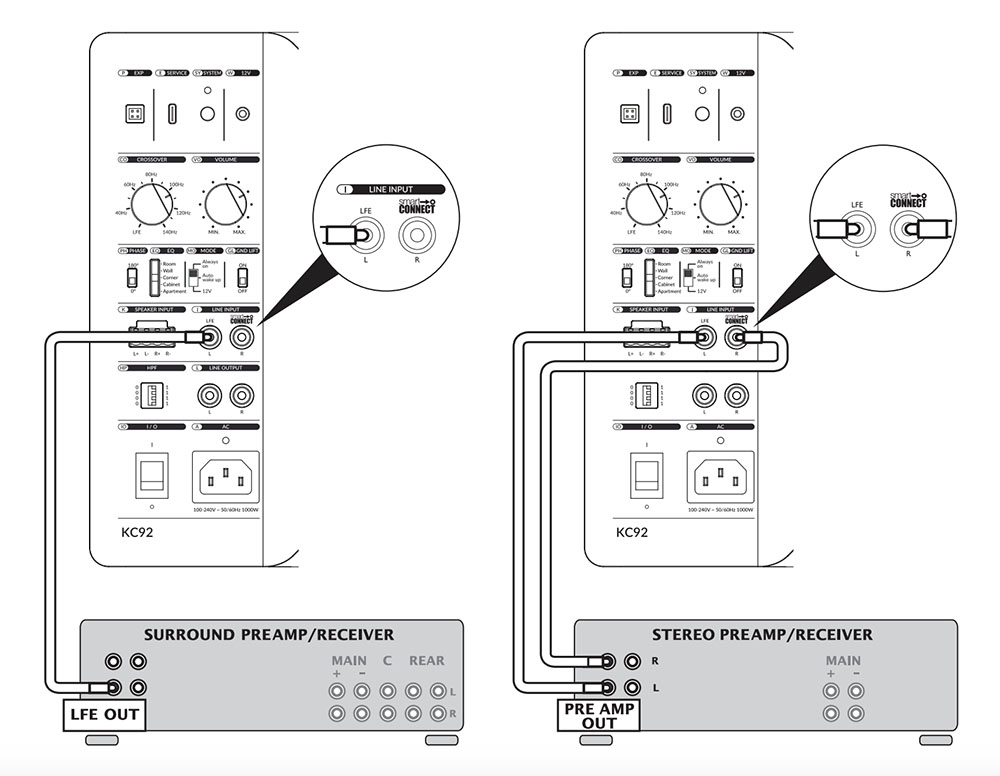 คุณสามารถเชื่อมต่อสัญญาณจากแอมป์มาที่ KC92 ได้ 2 ช่องทาง ช่องทางแรก เป็นการเชื่อมต่อสัญญาณเสียงในระดับ Line Level ซึ่งอาจจะดึงมาจากช่องเอ๊าต์พุต Pre-Out หรือช่อง Subwoofer Out ของปรีแอมป์หรืออินติเกรตแอมป์หรือรีซีฟเวอร์เซอร์ราวนด์ ผ่านเข้ามาที่ KC92 ทางอินพุต ‘LINE INPUT’ (11, 12) ซึ่งผู้ผลิตให้มา 2 ช่อง แยกเป็นช่องซ้าย L กับช่องขวา R โดยที่สามารถใช้งานได้หลายลักษณะ อย่างเช่นถ้านำ KC92 ไปใช้ในชุดดูหนัง ก็ให้ใช้อินพุตช่องซ้าย L แล้วปรับจุดตัด (2) ไปที่ตำแหน่ง LFE (หมุนปุ่มไปทางซ้ายสุด) ซึ่งจะเป็นการบายพาสวงจรโลว์พาสฟิลเตอร์ในตัว KC92 ออกไป ในกรณีนี้ KC92 จะทำหน้าที่เป็นแอ๊คทีฟ ซับวูฟเฟอร์แบบ full-range ที่ให้การตอบสนองความถี่ตั้งแต่ 200Hz ลงไปจนถึง 11Hz โดยที่กรณีนี้ คุณภาพของสัญญาณจะไปขึ้นอยู่กับคุณภาพของวงจร Low-pass filter ในตัวปรีโปรเซสเซอร์จากภายนอก