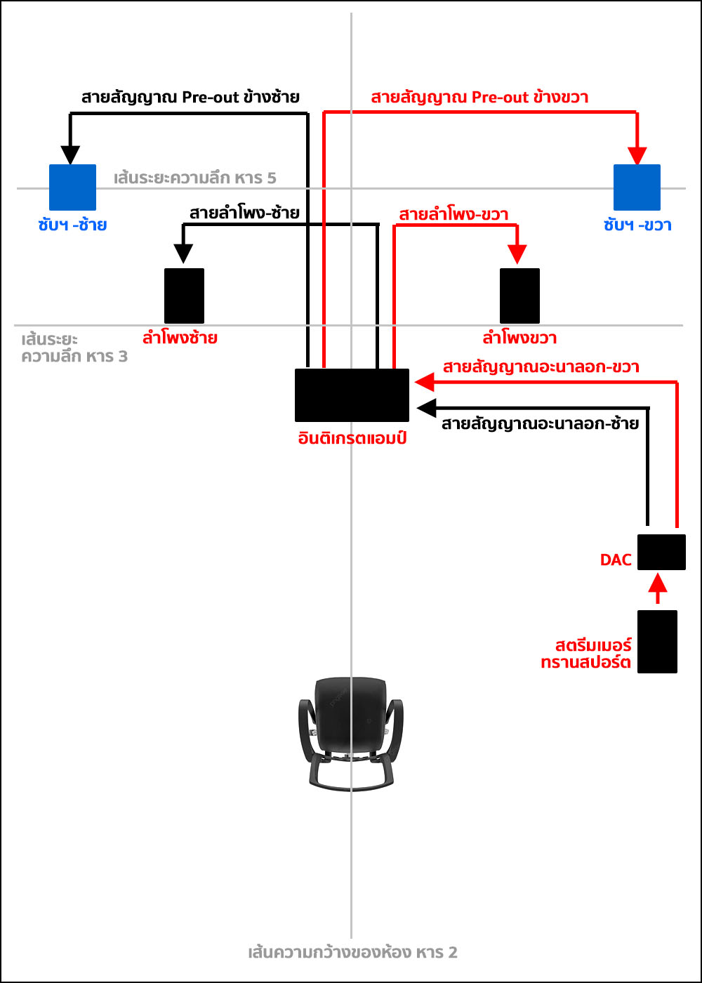 ผมเริ่มต้นด้วยการ แม็ทชิ่ง+เซ็ตอัพ+ปรับจูน ระหว่างลำโพงหลักกับแอมปลิฟายไปตามมาตรฐานของการเซ็ตอัพลำโพงที่ใช้กับชุดฟังเพลง 2 แชนเนลแบบปกติทุกประการ