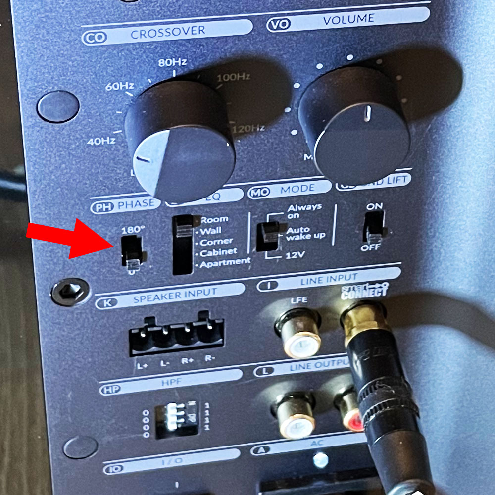 โดยหลักการแล้ว การปรับจูน ตำแหน่งของซับวูฟเฟอร์มีความหมายเดียวกันกับการปรับจูน เฟส” (phase) นั่นเอง ซึ่งในทางปฏิบัติแนะนำให้โยกสวิทช์ Phase (ภาพด้านบน) ที่แผงหลังของตัวซับฯ ไปที่ตำแหน่ง 0 องศา แล้วทิ้งค้างไว้แบบนั้นตลอด ไม่ต้องเปลี่ยน