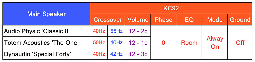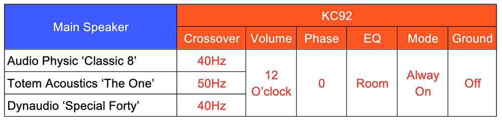 ส่วนกรอบด้านบนนี้คือการปรับตั้งฟังท์ชั่นอื่นๆ บนตัวซับวูฟเฟอร์ตอนเริ่มต้นก่อนไฟน์จูน โดยที่ตำแหน่งของ จุดตัดความถี่” (crossover) นั้นให้อ้างอิงกับความสามารถในการตอบสนอง ความถี่ต่ำสุดที่ลำโพงหลักสามารถทำได้ โดยดูได้จากตัวเลข Frequency Response ในสเปคฯ ของลำโพงหลัก จากตารางข้างบนนี้จะเห็นว่า ลำโพงบางคู่ อาทิเช่น Audio PhysicClassic 8นั้น จริงๆ แล้วตัวมันเองสามารถตอบสนองความถี่ต่ำลงไปได้ลึกถึง 35Hz แต่สเกลฯ จุดตัดต่ำสุดของวงจรครอสโอเว่อร์ในตัว KC92 มีมาให้แค่ 40Hz (คือเลือกได้ตั้งแต่ 40Hz – 140Hz) กรณีนี้จึงต้องเริ่มต้นที่ 40Hz ส่วนค่าอื่นๆ ก็ยึดตามที่ระบุไว้ในกรอบข้างบน
