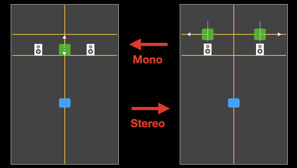 กรณีใช้ซับวูฟเฟอร์ ตัวเดียว” (mono sub) ให้เริ่มต้นจูนด้วยการวางลำโพงซับฯ ไว้ในตำแหน่งตรงกลางระหว่างลำโพงหลักซ้ายขวา (ตามรูปบนด้านซ้าย) หลังจากนั้น ในการปรับจูน phase ให้ใช้วิธีเลื่อนซับวูฟเฟอร์ลงไปตามแนวเส้นกึ่งกลางนั้น โดยที่ระยะการปรับจูนจะอยู่ในช่วงลูกศรสีขาว กินพื้นที่อยู่ในช่วงระยะความลึกของห้องหารด้วย 3 และหารด้วย 5 นั่นเอง แต่กรณีที่ใช้ซับวูฟเฟอร์ สองตัว” (stereo sub) ให้เริ่มต้นวางตำแหน่งซับฯ ทั้งสองตัวลักษณะตามรูปบนด้านขวา คือวางลำโพงซับฯ ของแต่ละข้างไว้ตรงกับ ด้านหลังของลำโพงหลัก ส่วนการปรับจูน phase สามารถทำได้ด้วยการค่อยๆ เลื่อนลำโพงซับฯ เข้าใกล้ผนังด้านข้างของแต่ละด้าน (ตามแนวลูกศรสีขาว)
