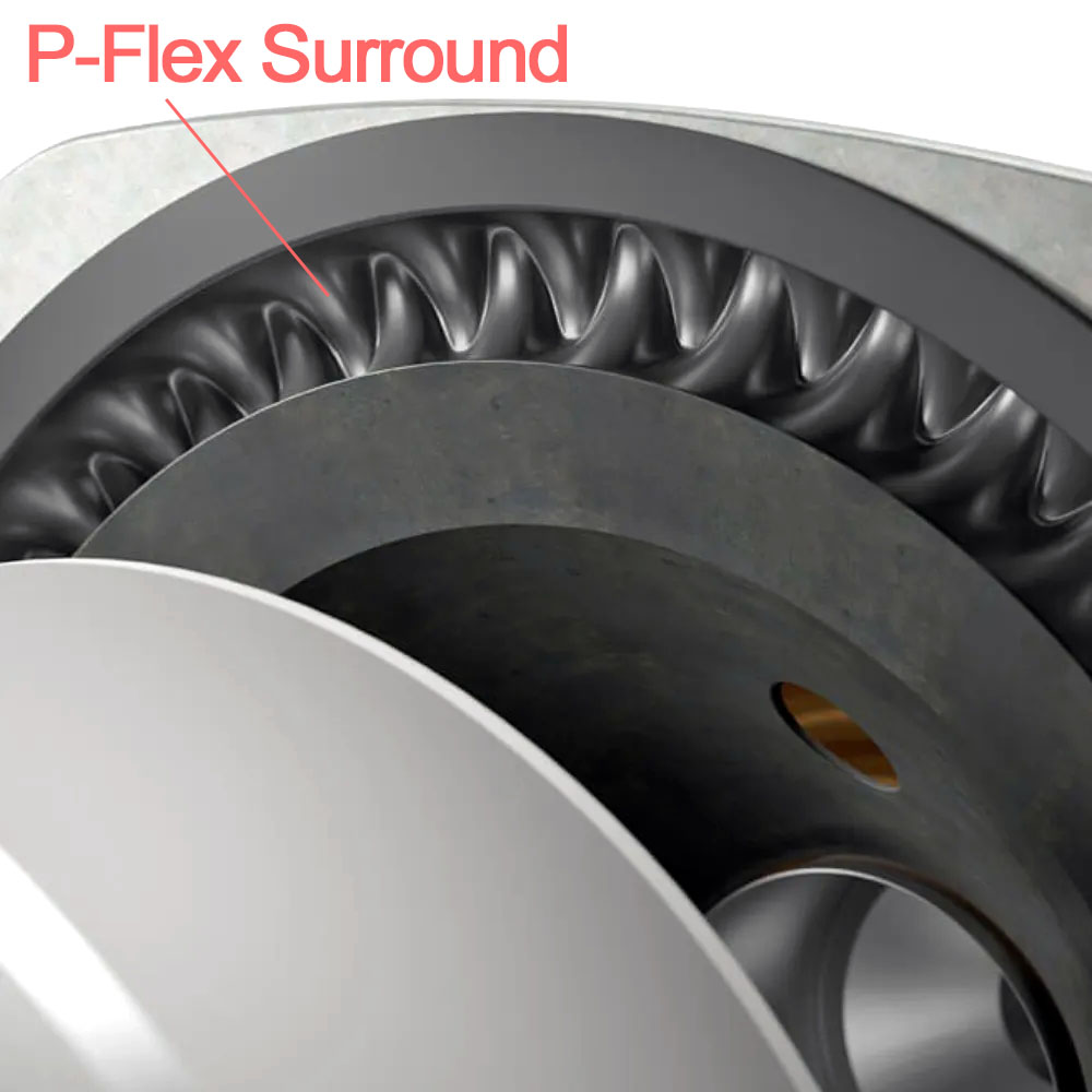 ยิ่งไปกว่านั้น เนื่องจากขณะทำงาน ไดอะแฟรมของไดเวอร์จะต้องขยับเคลื่อนที่เดินหน้าถอยหลังเข้าออกอย่างรวดเร็วและรุนแรงในการปั๊มความถี่ต่ำออกมา เพื่อไม่ให้การเคลื่อนที่ของไดอะแฟรมมีลักษณะที่เสียศูนย์ วิศวกรของ KEF จึงได้ออกแบบวงแหวน surround ที่เชื่อมโยงระหว่างขอบของไดอะแฟรมเข้ากับโครงโลหะของไดเวอร์ขึ้นมาเป็นพิเศษ แทนที่จะเป็นแค่วงแหวนยางแบบครึ่งวงกลมอย่างที่ใช้กันอยู่ทั่วไป พวกเขาได้ออกแบบให้วงแหวนยางนี้มีลักษณะเป็นลอนสลับบนล่างที่เรียกว่า P-Flex ซึ่งจะทำให้ขอบยางแบบนี้มีความยืดหยุ่นสูงกว่าแบบครึ่งวงกลมที่ใช้กันทั่วไป และด้วยรูปลักษณ์ที่เป็นลอนสลับลายบนวงแหวนนี้ยังทำให้การขยับเคลื่อนตัวของไดอะแฟรมมีความเสถียรมากขึ้นด้วย จะไม่บิดเบี้ยวเสียรูปตอนที่ต้องขยับเร็วๆ แรงๆ ขณะที่ปั๊มเสียงทุ้มต่ำๆ ออกมาเยอะๆ