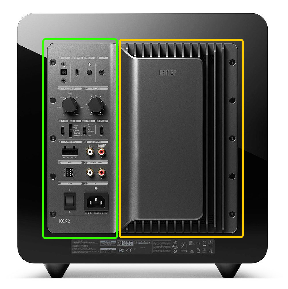 ที่ด้านหลังของตัว KC92 มีแผงอิเล็กทรอนิคส์ขนาดใหญ่ติดตั้งอยู่หนึ่งแผง บนพื้นที่ 25 x 25 ตารางเซนติเมตรของแผงนั้นถูกแบ่งออกเป็น 2 ส่วน ทางซ้ายในกรอบสีเขียวบนภาพด้านบนนั้นคือส่วนที่ติดตั้งปุ่มปรับฟังท์ชั่นต่างๆ ส่วนซีกขวาในกรอบสีส้มนั้นเป็นส่วนของครีบระบายความร้อน (ฮีทซิ้งค์) ที่เกิดจากการทำงานของวงจรขยาย class-D ซึ่งจะมีอุณหภูมิสูงขึ้นเวลาทำงาน จะรู้สึกอุ่นๆ ไม่ถึงกับร้อน ถ้าเอามือไปแตะ