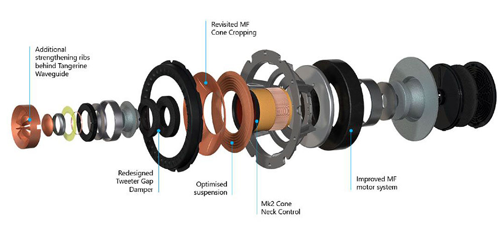 ซึ่งเป็นไดเวอร์ที่ออกแบบด้วยเทคนิค point source configuration คือวางไดเวอร์ขับแหลม (ทวีตเตอร์) เข้าไปแทรกอยู่ตรงใจกลางของไดเวอร์เบส/มิดเร้นจ์ที่ทำหน้าที่สร้างความถี่ในย่านกลางและทุ้ม ซึ่งเทคนิคนี้ทำให้เกิดผลดีต่อเสียงในแง่ของความกลมกลืนเป็นเนื้อเดียวกันระหว่างความถี่ย่านต่ำ–กลาง และสูง ทำให้ LS50 Wireless ให้เสียงที่มีความต่อเนื่อง ไหลลื่น และให้มิติเสียงที่ดี