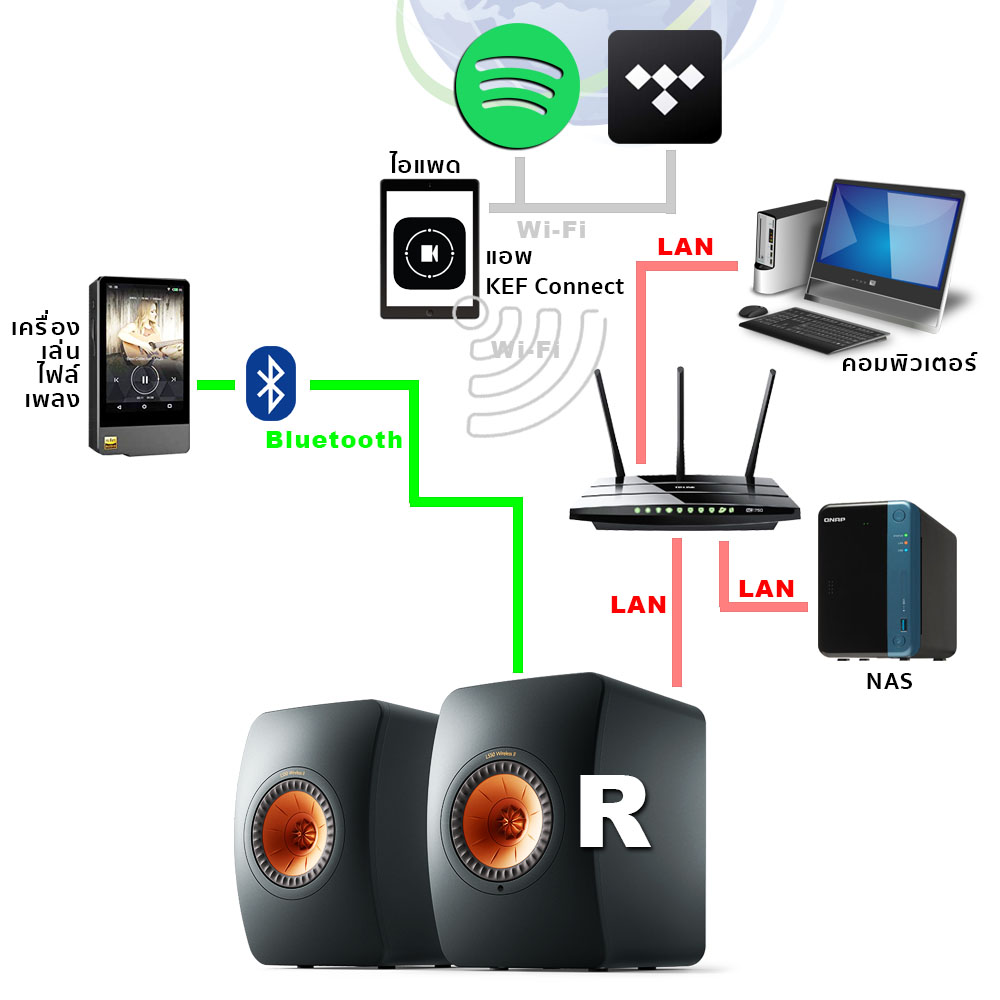 การฟังเพลงผ่าน LS50 Wireless II ด้วยวิธีสตรีมมิ่งผ่านทาง Wi-Fi นั้น ที่บ้านของคุณต้องมีระบบเน็ทเวิร์คด้วย ถ้าไม่มีระบบเน็ทเวิร์ค คุณจะสตรีมได้ทาง Bluetooth อย่างเดียว กรณีที่ต้องการคุณภาพของเสียงที่ดีที่สุด โดยเฉพาะจากการเล่นไฟล์เพลงที่มีความละเอียดสูง แนะนำให้ทำการเชื่อมต่อลำโพงทั้งสองข้างเข้ากับ router (network) ด้วยสาย LAN เข้าที่ลำโพงข้างขวา ซึ่งนอกจากจะได้คุณภาพเสียงที่ดีที่สุดแล้ว ยังได้ความเสถียรของการเชื่อมต่อที่ดีกว่าอีกด้วย