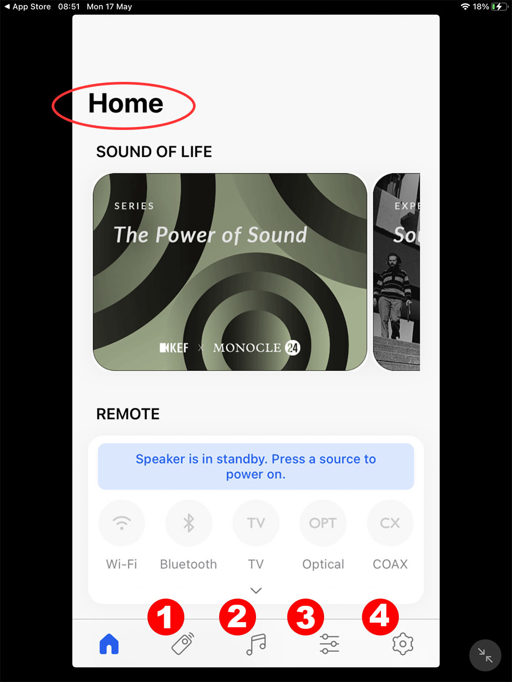 ในแอพฯ KEF Connect จะแบ่งฟังท์ชั่นต่างๆ ออกเป็น 4 กลุ่ม คือ Remote (1), Music (2), EQ Settings (3) และ Settings (4) ซึ่งแต่ละกลุ่มจะถูกแทนด้วยไอค่อนสัญลักษณ์ที่เรียงอยู่ตรงพื้นที่ด้านล่างของหน้า Home (ตามภาพด้านบน)