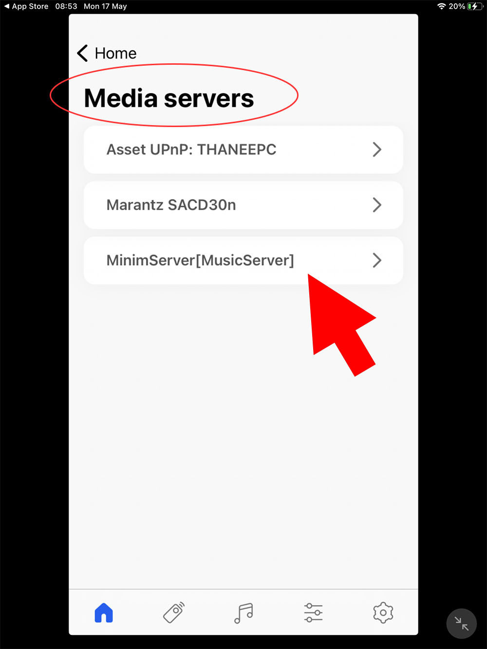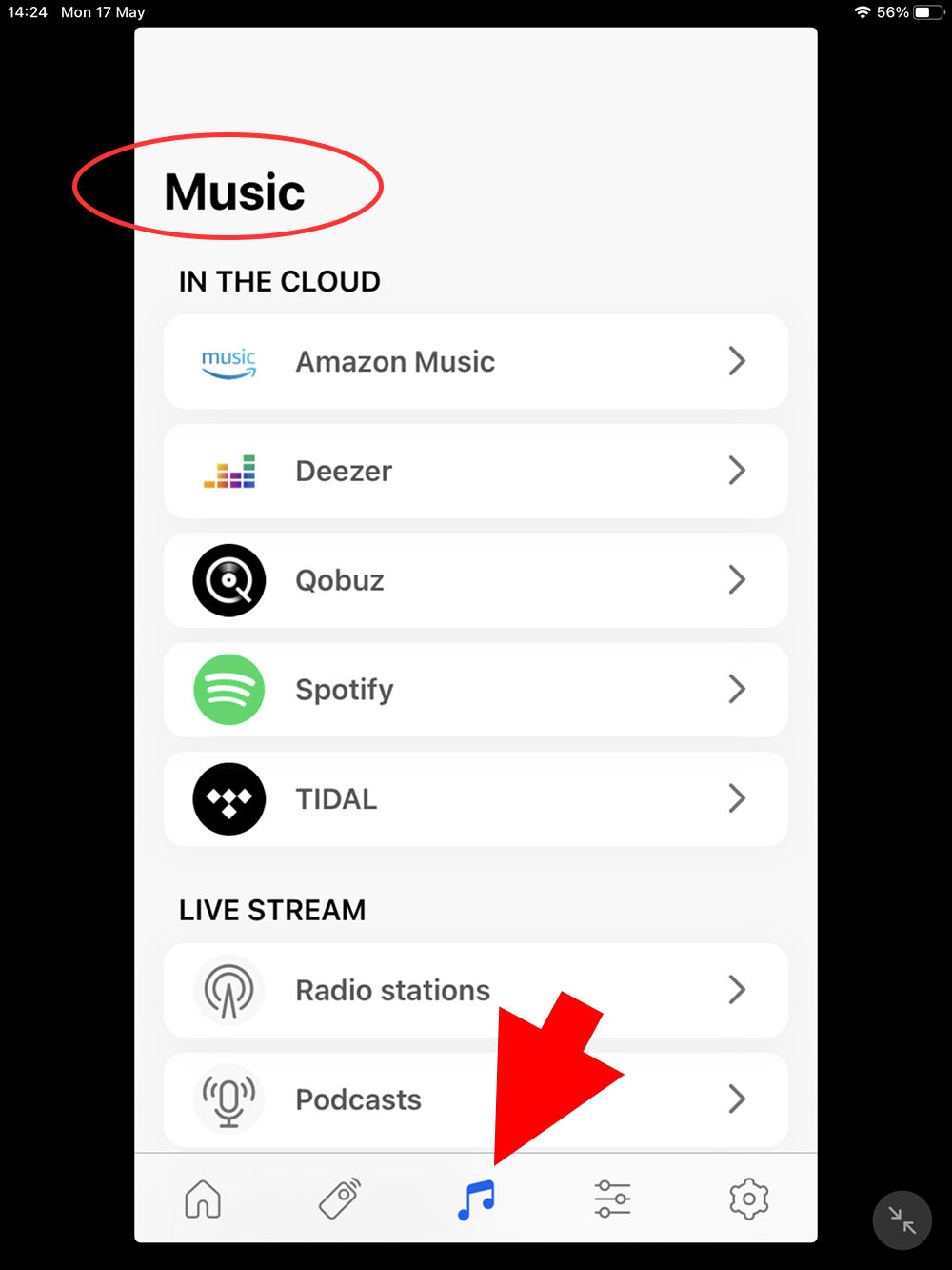 กลุ่มที่สอง “Music” – ไอค่อนถัดไปที่เป็นรูปตัวโน๊ตเป็นที่รวมของแหล่งต้นทาง (source) ของเพลงที่คุณต้องการฟัง ซึ่งแบ่งออกเป็น 3 แหล่ง แหล่งแรกคือ “In The Cloud” = รวมผู้ให้บริการสตรีมมิ่งบนอินเตอร์เน็ต อาทิ Amazon Music, DeeZer, Qobuz, Spotify และ TIDAL แหล่งที่สองคือ “Live Stream” = รวมแหล่งของสถานีวิทยุบนอินเตอร์เน็ตกับรายการสนทนา แหล่งที่สามคือ “On Your Network” = รวมแหล่งเก็บไฟล์เพลงของคุณเองที่อยู่บนเน็ทเวิร์คเดียวกัน ซึ่งจะถูกรวมอยู่ในหัวข้อ Media servers
