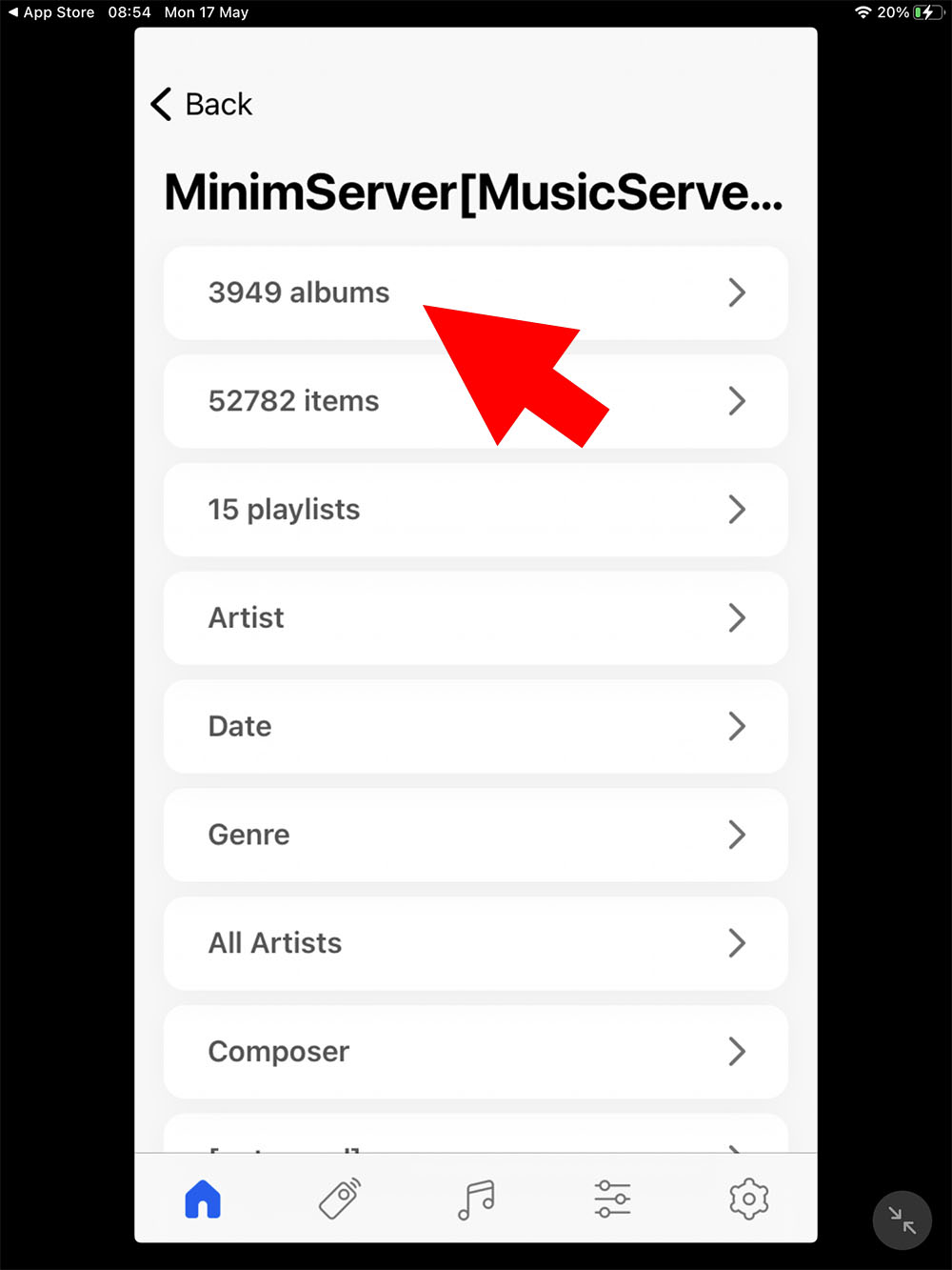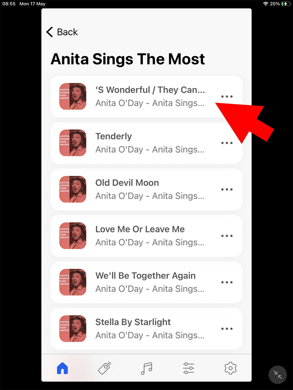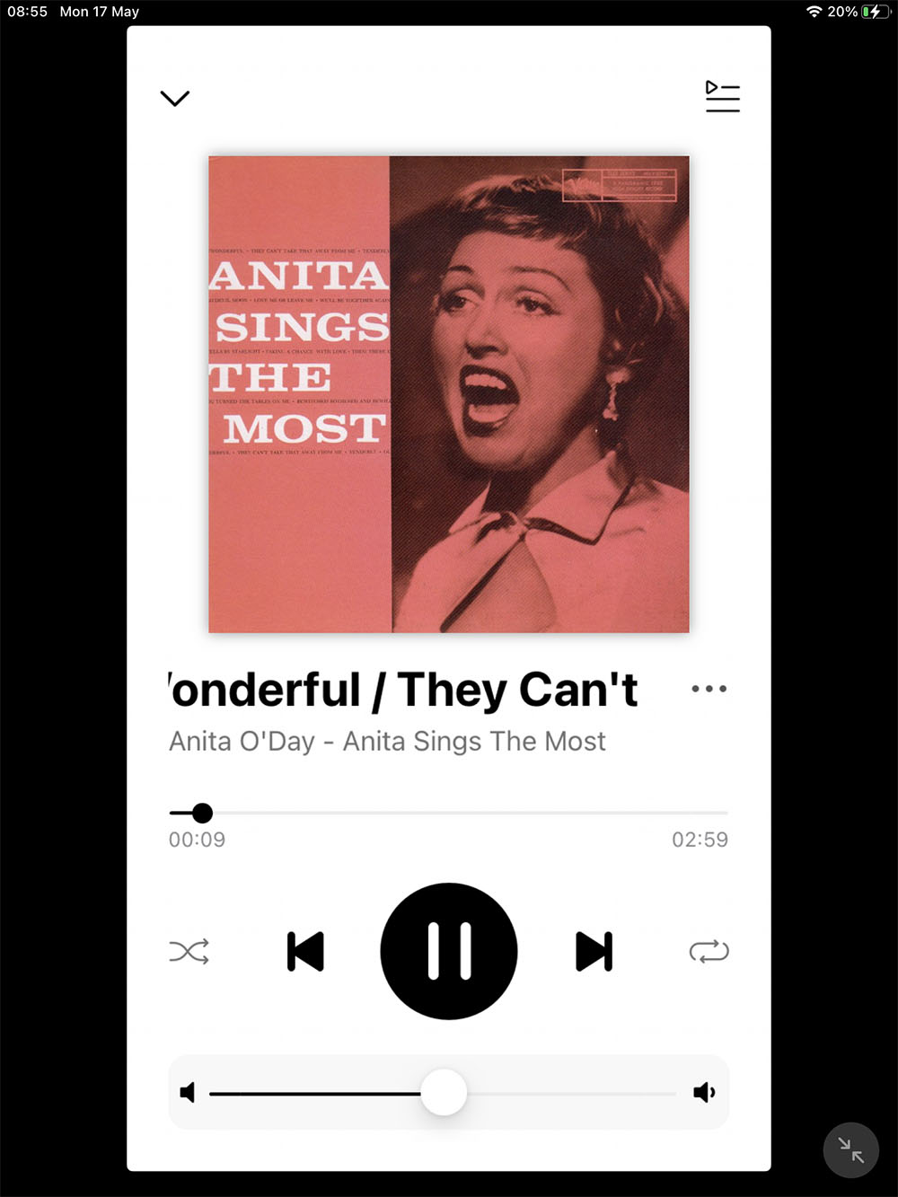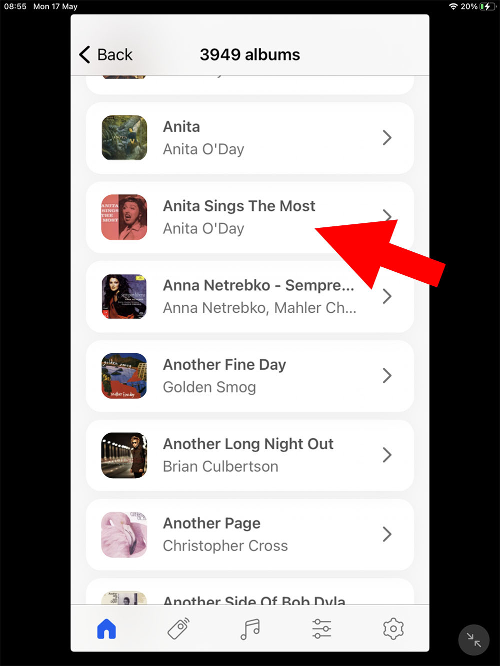 ผมทดลองเลือกฟังไฟล์เพลงจากไฟล์ที่ผมเก็บไว้ใน NAS ของผมเองซึ่งเชื่อมต่ออยู่ในเน็ทเวิร์คเดียวกับ LS50 Wireless II เมื่อจิ้มปลายนิ้วลงไปที่ “MinimServer[MusicServer]” (ผมใช้โปรแกรม MinimServer ทำหน้าที่ MusicServer เพื่อให้ LS50 Wireless II มองเห็นและดึงไฟล์ได้) และเลือกให้แอพฯ ดึงไฟล์เพลงใน NAS ของผมออกมาโชว์ในรูปแบบของ “album” ซึ่งในนั้นมีอยู่ 3,949 อัลบั้ม แอพฯ ตัวนี้ใช้วิธีโชว์ด้วยภาพปกในกรอบสี่เหลี่ยมอยู่ทางขวาและมีชื่ออัลบั้มกับศิลปินอยู่ทางซ้าย ผมสามารถเลื่อนหน้าจอขึ้น–ลงเพื่อเลือกอัลบั้มที่ต้องการได้ ผมทดลองเลือกอัลบั้มชุด “Anita Sings The Most” ของ Anita O’Day ขึ้นมาลองฟัง ทุกอย่างทำงานได้อย่างไหลลื่นมาก เป็นแอพฯ ที่ใช้งานง่าย ไม่ซับซ้อน และมีความเสถียรสูง