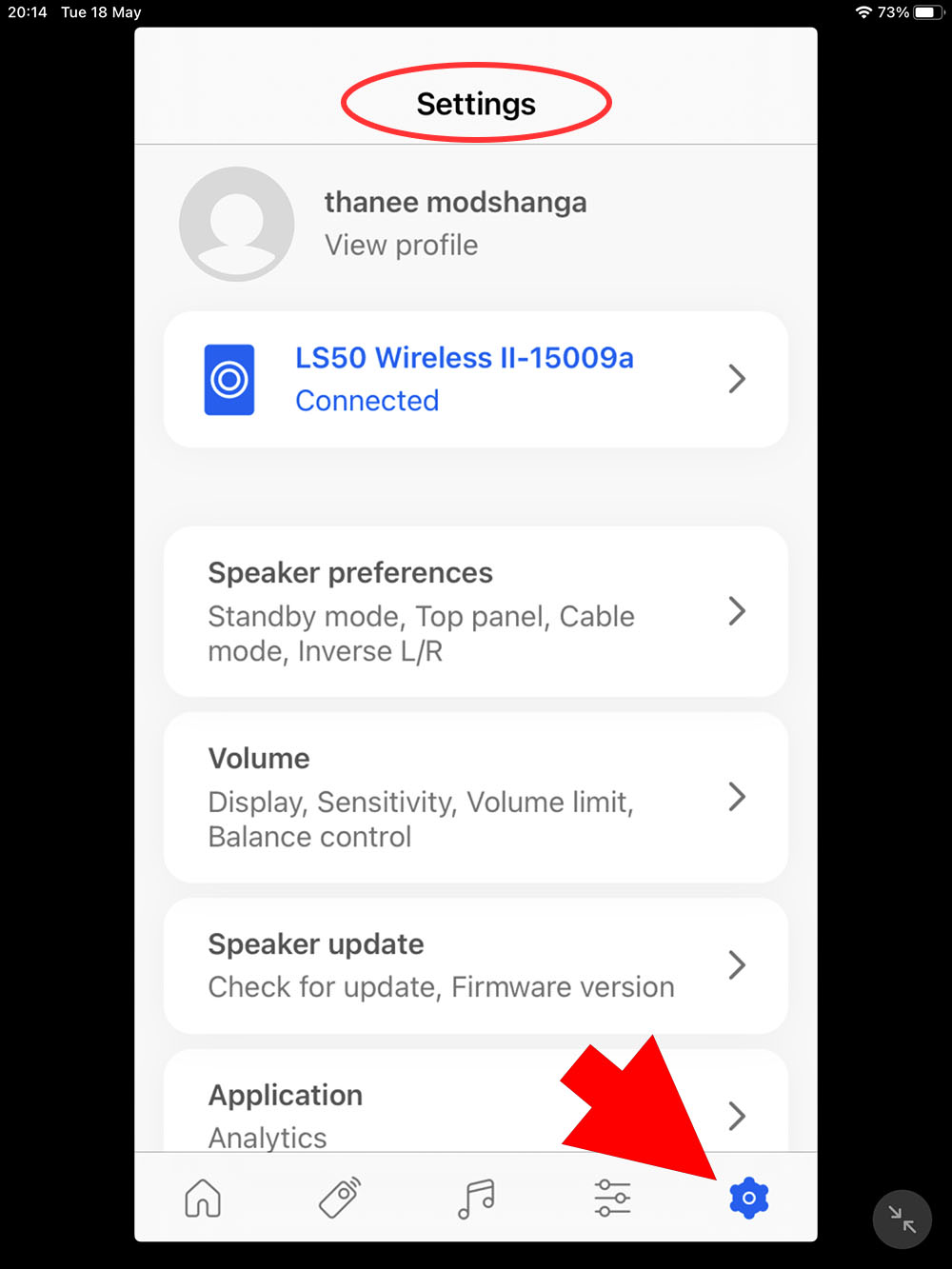 กลุ่มที่สี่ “Settings” – เป็นที่รวมของการปรับตั้งค่าอื่นๆ ของตัวลำโพง ซึ่งแบ่งออกเป็น 6 กลุ่มย่อย คือ “Speaker preference”, “Volume”, “Speaker update”, “Application”, “Support” และ “About”
