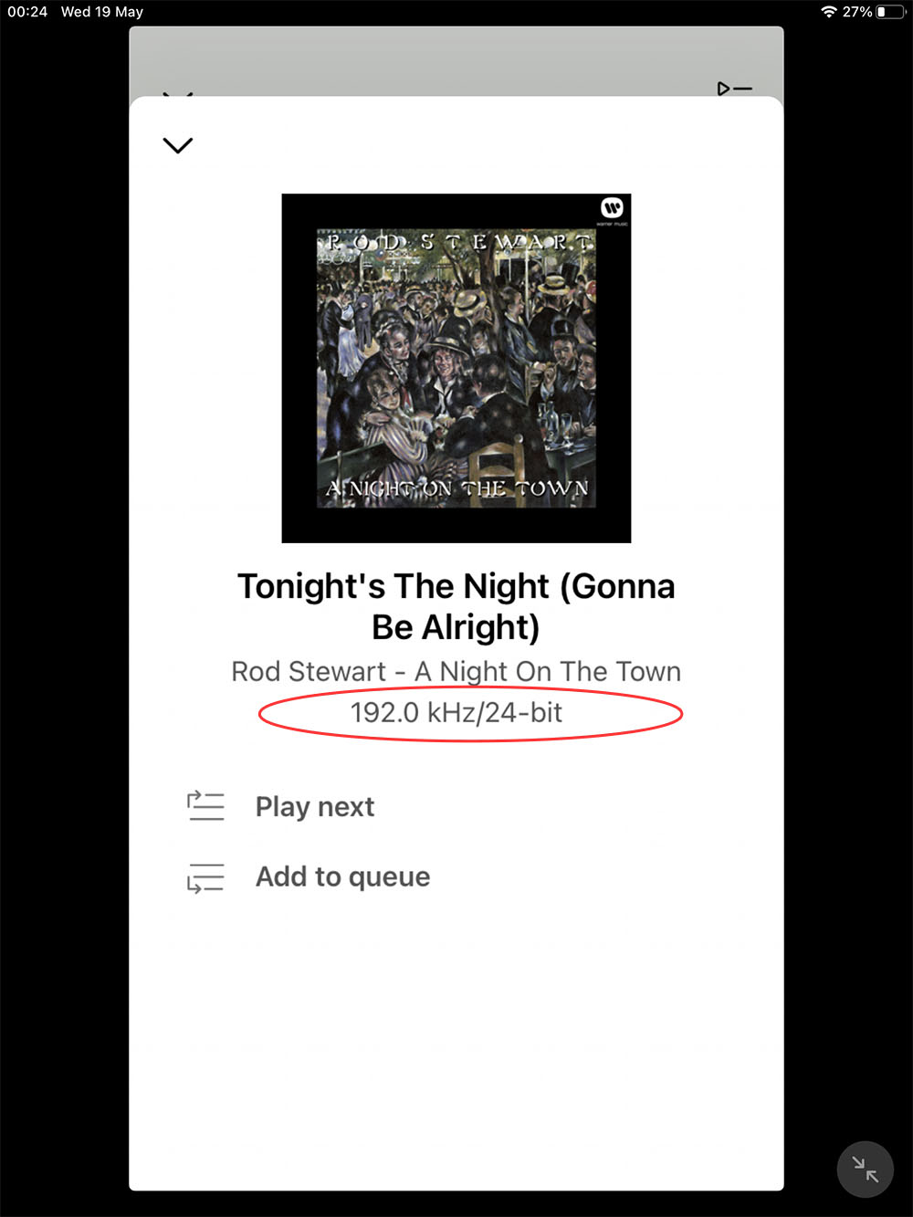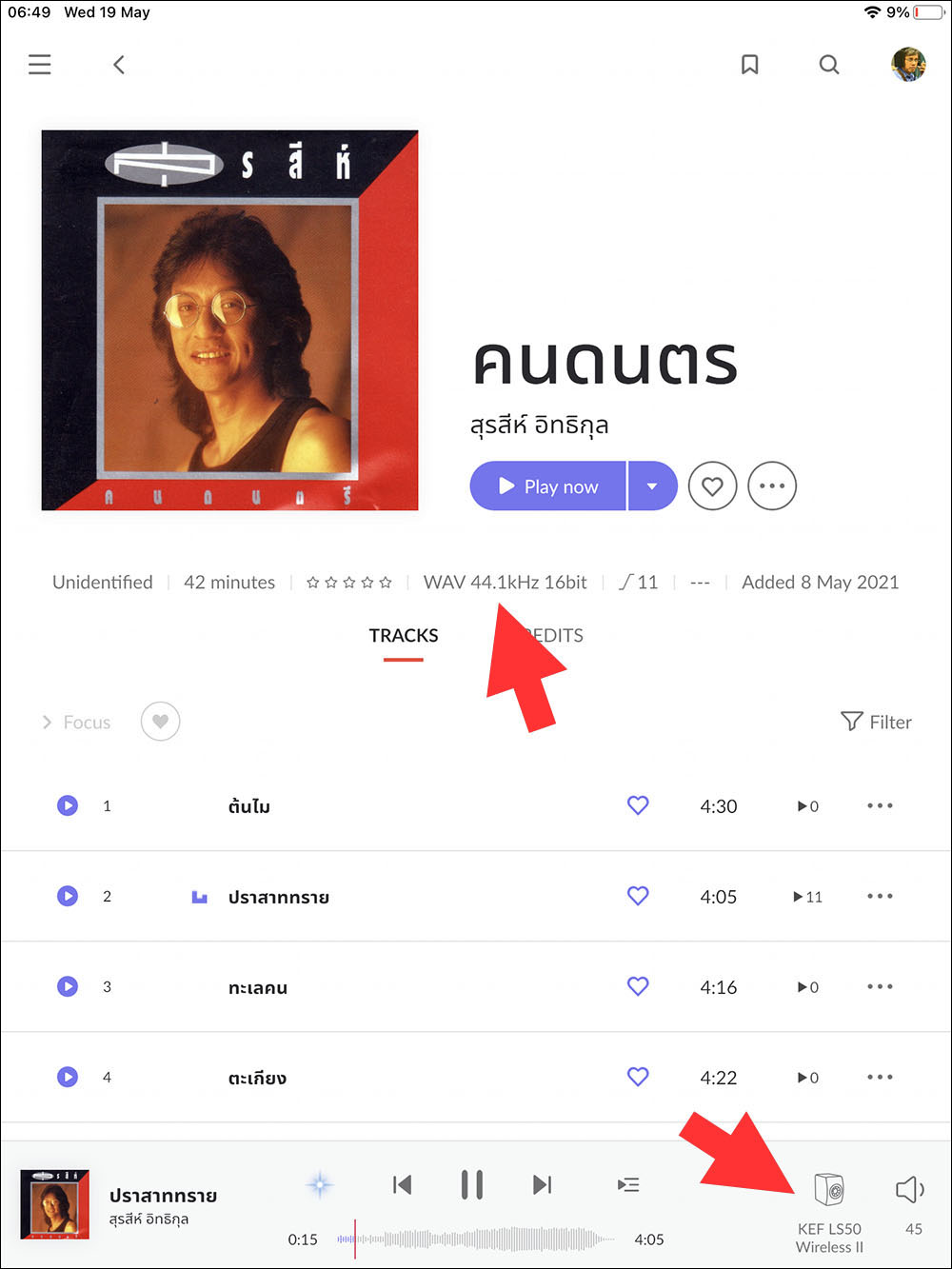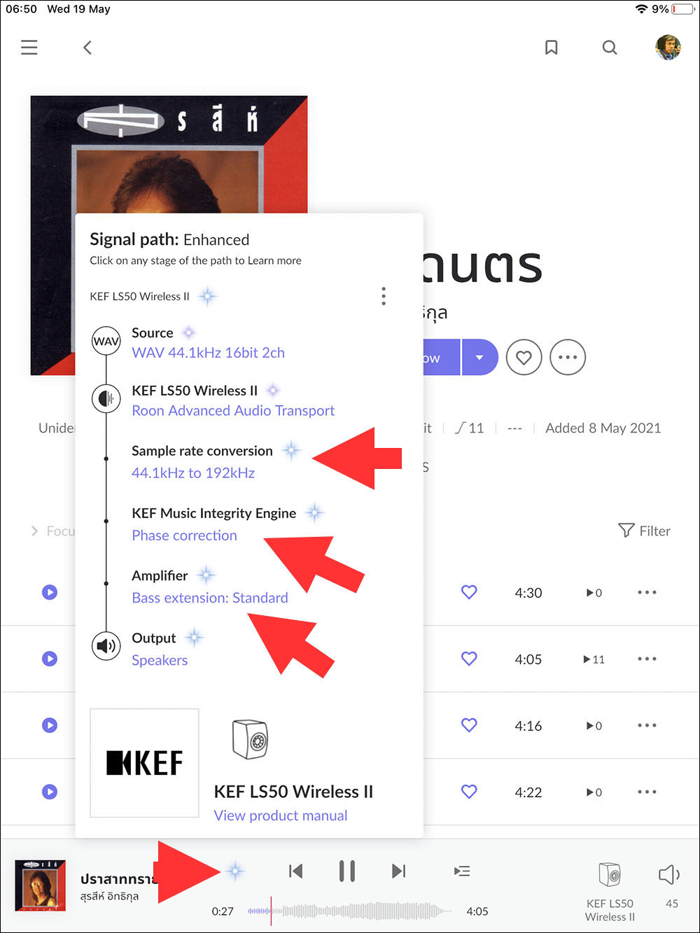 ผมเริ่มฟังด้วยไฟล์ WAV 16/44.1 ที่ผมริปมาจากแผ่นซีดี จากภาพหน้าจอของแอพฯ roon remote ผมพบว่า LS50 Wireless II ทำการอัพคอนเวิร์ต sampling rate ของสัญญาณต้นทางที่รับมาจาก roon ที่ระดับ 44.1kHz ให้ขึ้นไปที่ระดับ 192kHz ก่อนจะส่งเข้าสู่วงจรปรับแต่งเสียงของ LS50 Wireless II ที่ชื่อว่า “KEF Music Intergrity Engine” ให้ทำการปรับปรุงทางด้านเฟสสัญญาณ (phase correction) ให้มีความถูกต้องตรงกับต้นทางสัญญาณก่อน จากนั้นก็นำสัญญาณที่ปรับปรุงเฟสแล้วไปเข้าสู่กระบวนการขยายย่านเสียงทุ้มด้วยมาตรฐาน standard (คุณสามารถเข้าไปปรับตั้งระดับได้ในเมนูของ LS50 Wireless II) แล้วจึงขยายเสียงออกไปทางลำโพง