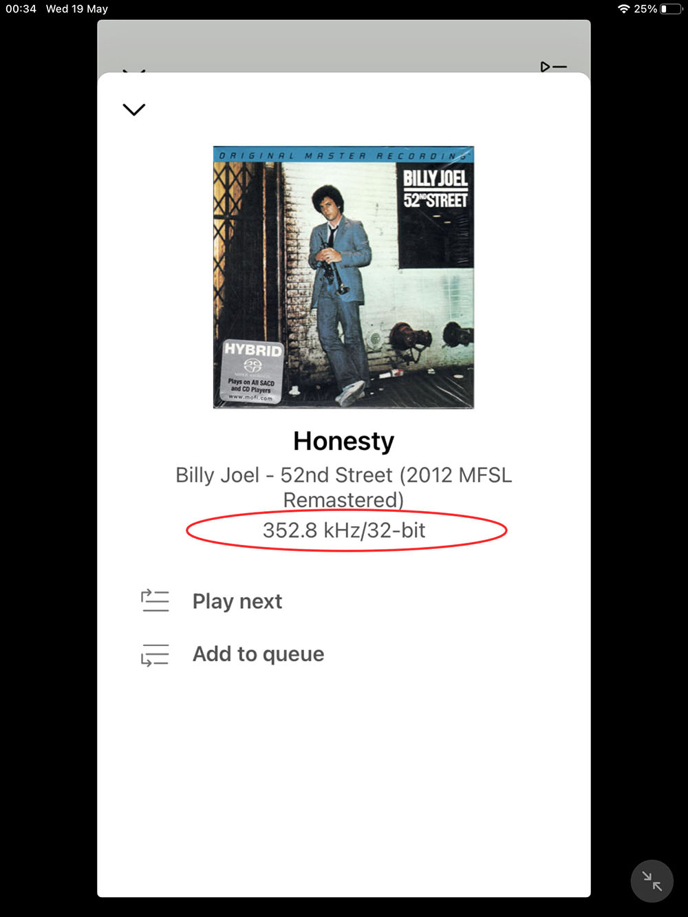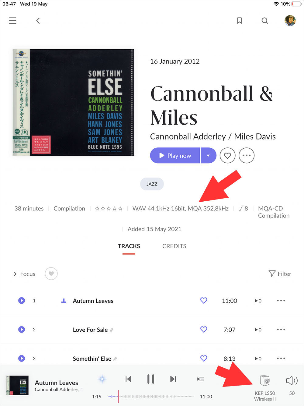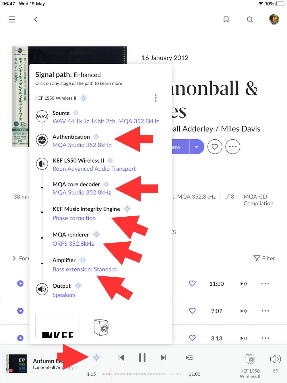 ขั้นตอนต่อไป ผมทดลองเล่นไฟล์เพลง MQA ที่ผมริปจากแผ่น MQA-CD ของผมออกมาเป็นไฟล์ WAV 16/44.1 ซึ่งเก็บอยู่ใน NAS ขึ้นมาฟังด้วยโปรแกรม roon แล้วส่งสัญญาณไปที่ LS50 Wireless II ผมพบว่า โปรแกรม roon ทำการตรวจสอบไฟล์ MQA ได้แล้วจัดส่งสัญญาณ PCM 16/44.1 พร้อมไฟล์ MQA ต้นฉบับไปให้ LS50 Wireless II เพื่อทำการแตกไฟล์ MQA และแปลงสัญญาณออกมาตามแซมปลิ้งเรตของสัญญาณ PCM ที่แพ็คมากับไฟล์ MQA นั้น ซึ่งก็คือแซมปลิ้งที่ระดับ 352.8kHz สรุปก็คือ LS50 Wireless II สามารถ decode และ render ไฟล์ MQA ออกมาได้สุดสายปลายทางของสัญญาณออริจินัลที่มาจากสตูดิโอนั่นเอง.!! สุดมาก..!!!