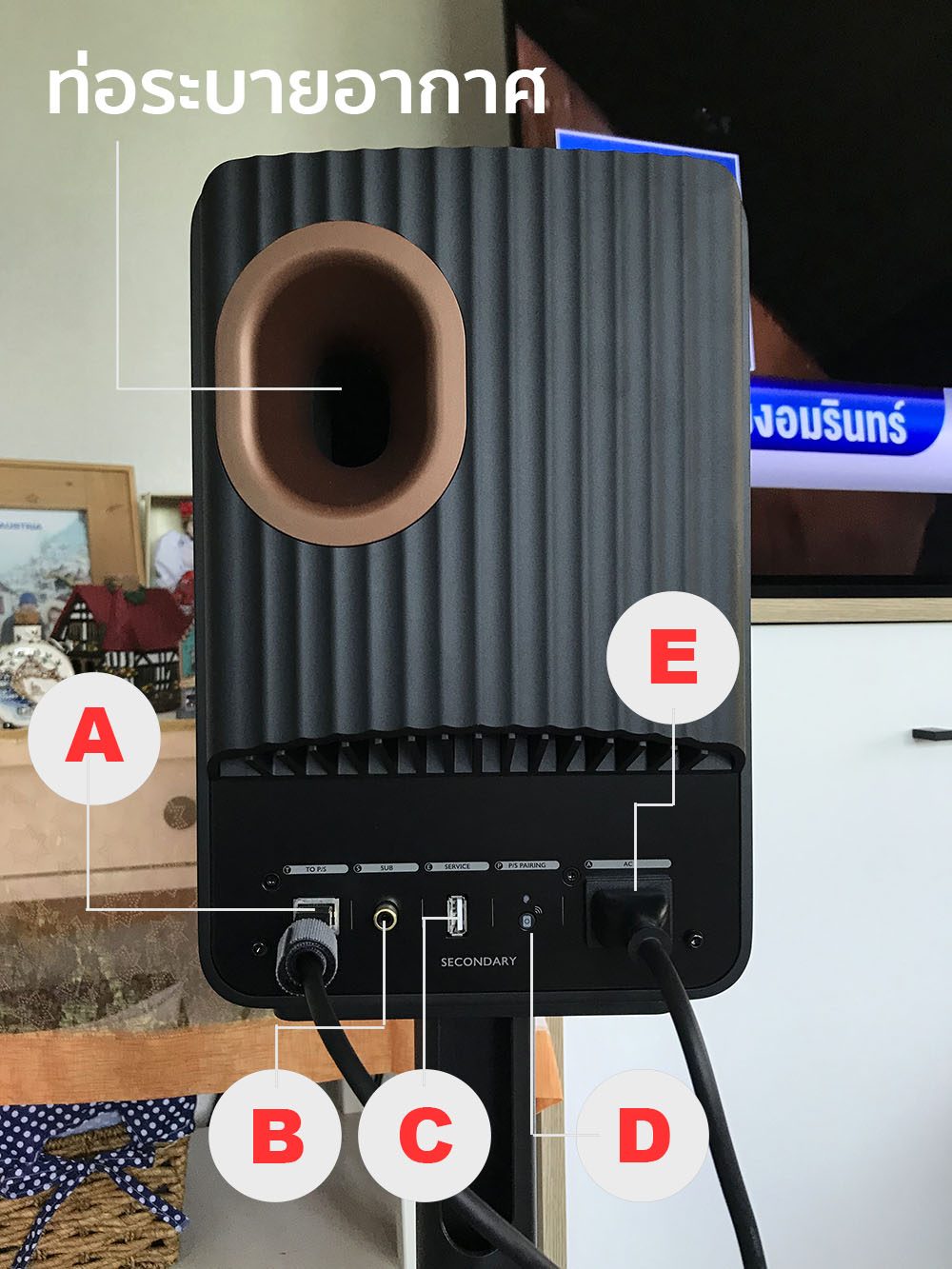 D = ปุ่มกดเพื่อเชื่อมต่อระหว่างลำโพงซ้ายและขวาด้วยวิธีไร้สายผ่าน Wi-Fi
