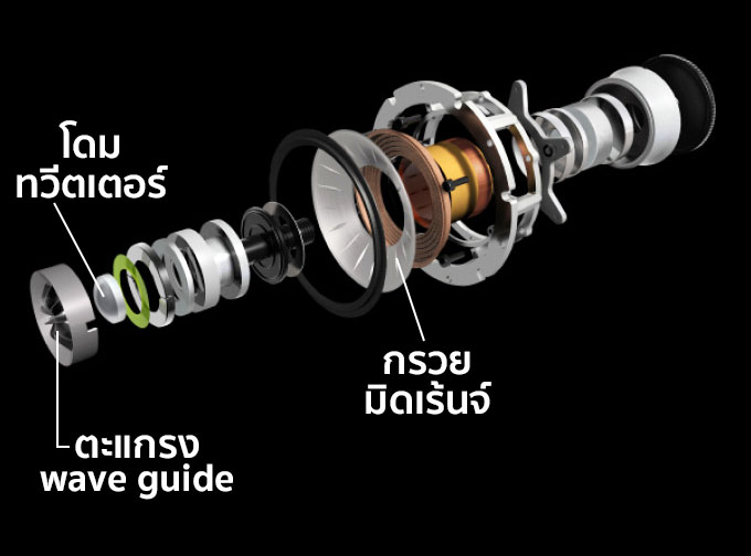 ภาพด้านบนนี้คือลักษณะโครงสร้างภายในของไดเวอร์ Uni-Q ที่ใช้อยู่ในลำโพงรุ่นนี้และรุ่นอื่นๆ จะเห็นว่า ภายในตัวไดเวอร์มีชิ้นส่วนที่ประกอบกันอยู่หลายชิ้นมาก โครงสร้างมีลักษณะที่ซับซ้อนแต่ทั้งหมดนั้นก็เพื่อผลทางด้านประสิทธิภาพและความแม่นยำในการสร้างความถี่เสียงในย่านกลางต่ำขึ้นไปถึงเสียงแหลมทั้งหมด