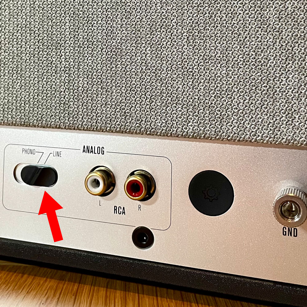 ที่ข้างขั้วต่อ RCA จะมีสวิทช์เลื่อนอันเล็กๆ (4) สำหรับเลื่อนสลับอินพุตที่เสียบเข้าที่ช่อง RCA ระหว่าง LINE กับ PHONO และทางขวามือสุดของแผงหลังจะมีขั้วต่อกราวนด์ (7) ติดตั้งอยู่หนึ่งจุด ใช้สำหรับเชื่อมต่อสายกราวนด์ของเครื่องเล่นแผ่นเสียง