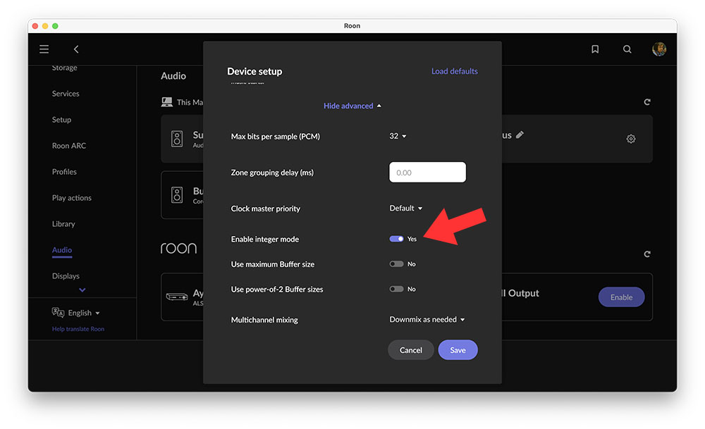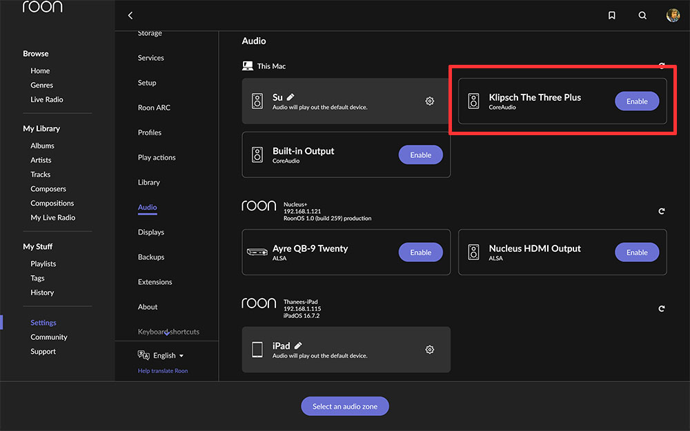 ผมใช้โปรแกรม Roon บน Macbook Pro เล่นไฟล์เพลงแล้วส่งผ่านเอ๊าต์พุตมาเข้าที่อินพุต USB-C ของ The Three Plus โดยไม่ต้องลงไดเวอร์ใดๆ ซึ่งโปรแกรม Roon ก็มองเห็น The Three Plus เป็นเอ๊าต์พุตทันที (ในกรอบสีแดง)