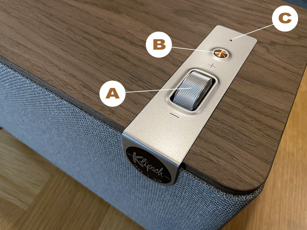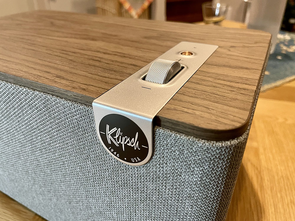 ที่มุมบนด้านขวาส่วนหน้าของตัวถังมีแผ่นโลหะที่กว้าง 3.5 ซ.ม. x ยาวประมาณ 12.5 ซ.ม. แปะทับอยู่บนแผ่นไม้และคาดเลยมาที่แผงหน้าโดยพับเป็นมุมฉากลงมาแล้วตัดปลายให้โค้งมน ซึ่งตรงส่วนที่พับลงมาบนแผงด้านหน้านั้นมีโลโก้ของ Klipsch พร้อมปีเกิด 1946 และแหล่งกำเนิดคือ USA พิมพ์กำกับด้วยตัวหนังสือสีโลหะบนพื้นดำอยู่ตรงนั้น เป็นการออกแบบป้ายยี่ห้อที่ดูเท่มาก.! แต่ที่เท่มากกว่านั้นก็คือสวิทช์หมุนปรับความดัง ซึ่งทำเป็นปุ่มหมุนขนาดใหญ่ที่ฝังอยู่ในตัวตู้ โผล่บางส่วนของปุ่มขึ้นมาเพื่อให้ผู้ใช้สามาถใช้ปลายนิ้วเลื่อนหมุนปุ่มไปด้านบน (ด้านที่มีเครื่องหมายบวกกำกับอยู่) เพื่อปรับเพิ่มความดัง หรือหมุนปรับลงมาด้านล่าง (ด้านที่มีเครื่องหมายลบกำกับอยู่) เพื่อลดความดังได้