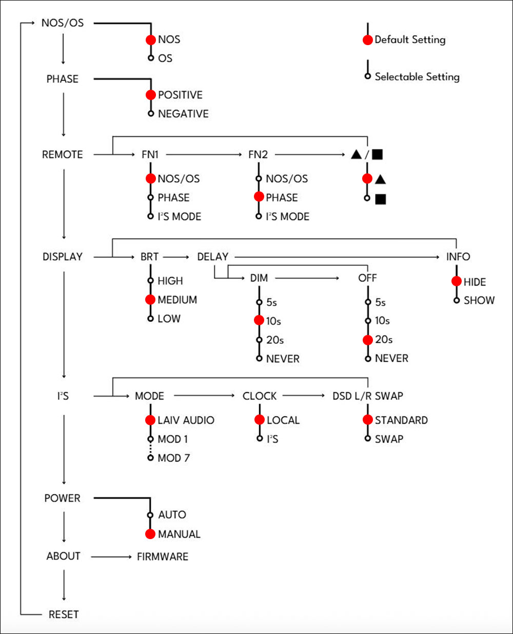 มีหัวข้อเมนูอยู่ทั้งหมด 7 หัวข้อ คือ NOS/OS, PHASE, REMOTE, DISPLAY, I2S, POWER และ ABOUT ซึ่งแต่ละหัวข้อเมนูหลักจะมีหัวข้อเมนูย่อยให้เลือกปรับตั้งมาก-น้อยตามที่เห็นในชาร์ตข้างบนนั้น หัวข้อเมนูที่ส่งผลกับเสียงอย่างชัดเจนมีอยู่ 2 หัวข้อ คือ NOS/OS กับ PHASE