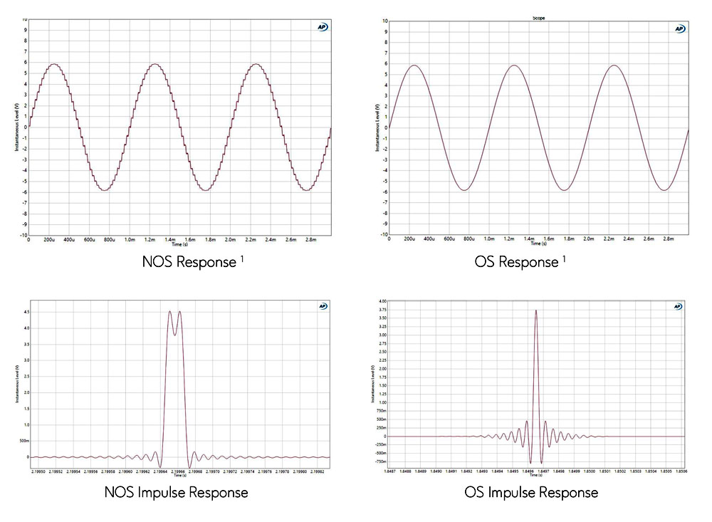 เมื่อมองจากกราฟของสัญญาณเอ๊าต์พุตในภาพข้างบน ซึ่งเปรียบเทียบระหว่างกราฟที่ได้จากการเลือก NOS (ซ้าย) กับ OS (ขวา) จะเห็นว่า การเปิดใช้ฟังท์ชั่น OS (Oversampling) จะให้สัญญาณเอ๊าต์พุตที่มีความราบเรียบมากกว่า (ฟังท์ชั่นนี้จะไม่ส่งผลกับสัญญาณอินพุตที่เป็นฟอร์แม็ต DSD) และตอบสนองกับสัญญาณทรานเชี้ยนต์ (impulse response) ได้เร็วกว่าด้วย (ทรานเชี้ยนต์คมกว่า)