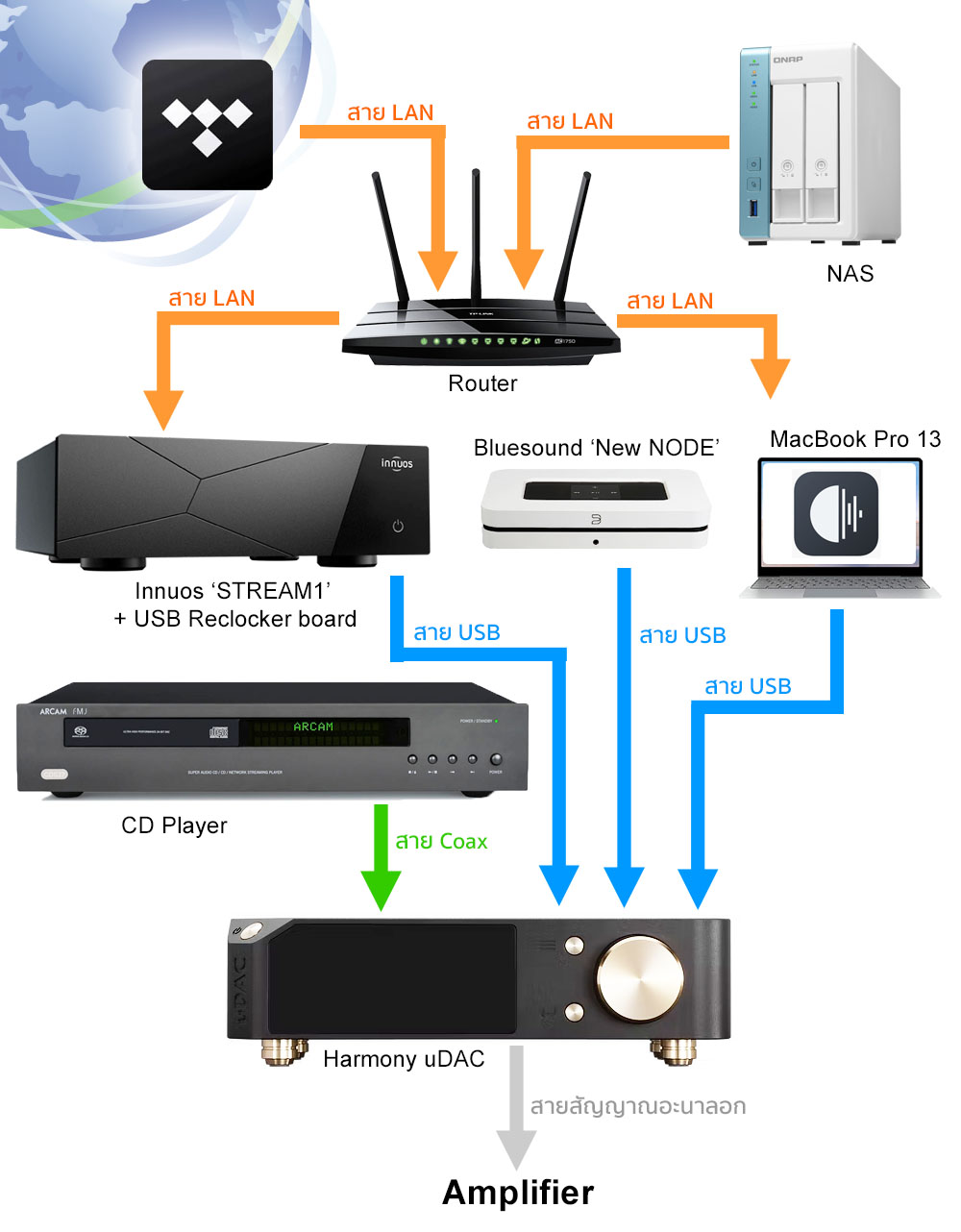 ส่วน BluesoundNew NODE’ (REVIEW) กับ InnuosSTREAM1’ (REVIEW) สองตัวนั้นเป็นสตรีมมิ่ง ทรานสปอร์ต ซึ่งก็ทำหน้าที่แบบเดียวกับ MacBook Pro 13 ทุกอย่าง เหตุผลที่ผมนำ BluesoundNew NODE’ กับ STREAM1 เข้ามาทดลองใช้งานร่วมกับ Harmony µDAC ตัวนี้ก็เพื่อทดสอบขีดความสามารถของตัว Harmony µDAC ว่าจะไปได้ไกลแค่ไหนกับสตรีมมิ่ง ทรานสปอร์ตต่างระดับกันมากๆ อย่างเช่น InnuosSTREAM1’ ตัวนี้ถือว่าเป็นสตรีมเมอร์ ทรานสปอร์ตระดับไฮเอ็นด์ฯ (*บวกภาคจ่ายไฟลิเนียร์ฯ LPS1 พร้อมบอร์ด USB Reclocker ราคารวมกันเกือบแสนห้า) ที่ถูกสร้างขึ้นมาโดยมุ่งเน้นคุณภาพเสียงสูงสุด ซึ่งเทียบราคากันแล้ว STREAM1 + บอร์ด USB Reclocker มีราคาสูงกว่า Harmony µDAC อยู่ประมาณสามเท่ากว่าๆ