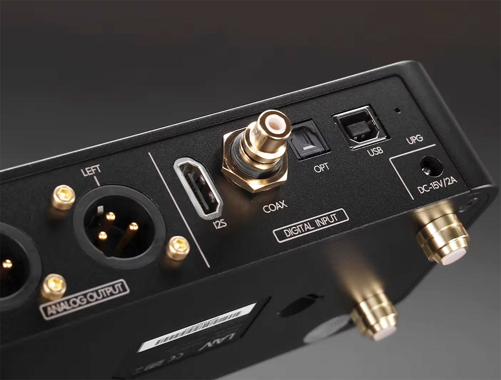 ขั้วต่อสำหรับสัญญาณอินพุตและเอ๊าต์พุตทั้งหมดถูกติดตั้งไว้ที่แผงด้านหลัง แยกส่วนกันชัดเจน ตามภาพด้านบนนั้น ซีกขวาคืออินพุตสำหรับสัญญาณดิจิตัลที่ให้มาทั้งหมด 4 ช่อง คือ USB (7), Optical (8), Coaxial (9) และ I2S (10) ขาด AES/EBU ซึ่งทั้งสี่ช่องนี้มีความสามารถในการรองรับสัญญาณดิจิตัลได้ต่างกัน แยกเป็น 2 กลุ่ม 2 ระดับ กลุ่มแรกคือช่อง USB กับช่อง I2S จะรองรับสัญญาณได้กว้างกว่า Optical กับ Coaxial คือรองรับฟอร์แม็ต PCM ได้ตั้งแต่ระดับแซมปลิ้งที่ 44.1kHz ขึ้นไปจนถึง 768kHz ส่วนฟอร์แม็ต DSD รองรับได้ตั้งแต่ DSD64 ไปจนถึงระดับ DSD256 ซึ่งถือว่ารองรับได้กว้างสุดแล้วสำหรับมาตรฐานปัจจุบัน ในขณะที่อินพุต Coaxial กับ Optical ซึ่งเป็นกลุ่มที่สองนั้นรองรับสัญญาณอินพุตที่เป็นฟอร์แม็ต PCM ได้ตั้งแต่ 44.1kHz ไปจนถึงระดับ 192kHz ส่วนฟอร์แม็ต DSD รับได้แค่ระดับ DSD64 และต้องอยู่ในฟอร์แม็ต DoP (DSD over PCM) เท่านั้น ซึ่งจริงๆ แล้วก็ต้องถือว่าดีกว่ามาตรฐานทั่วไปแล้ว เพราะช่องอินพุต coaxial กับ optical ของ ext.DAC ส่วนใหญ่จะไม่รองรับสัญญาณ DSD