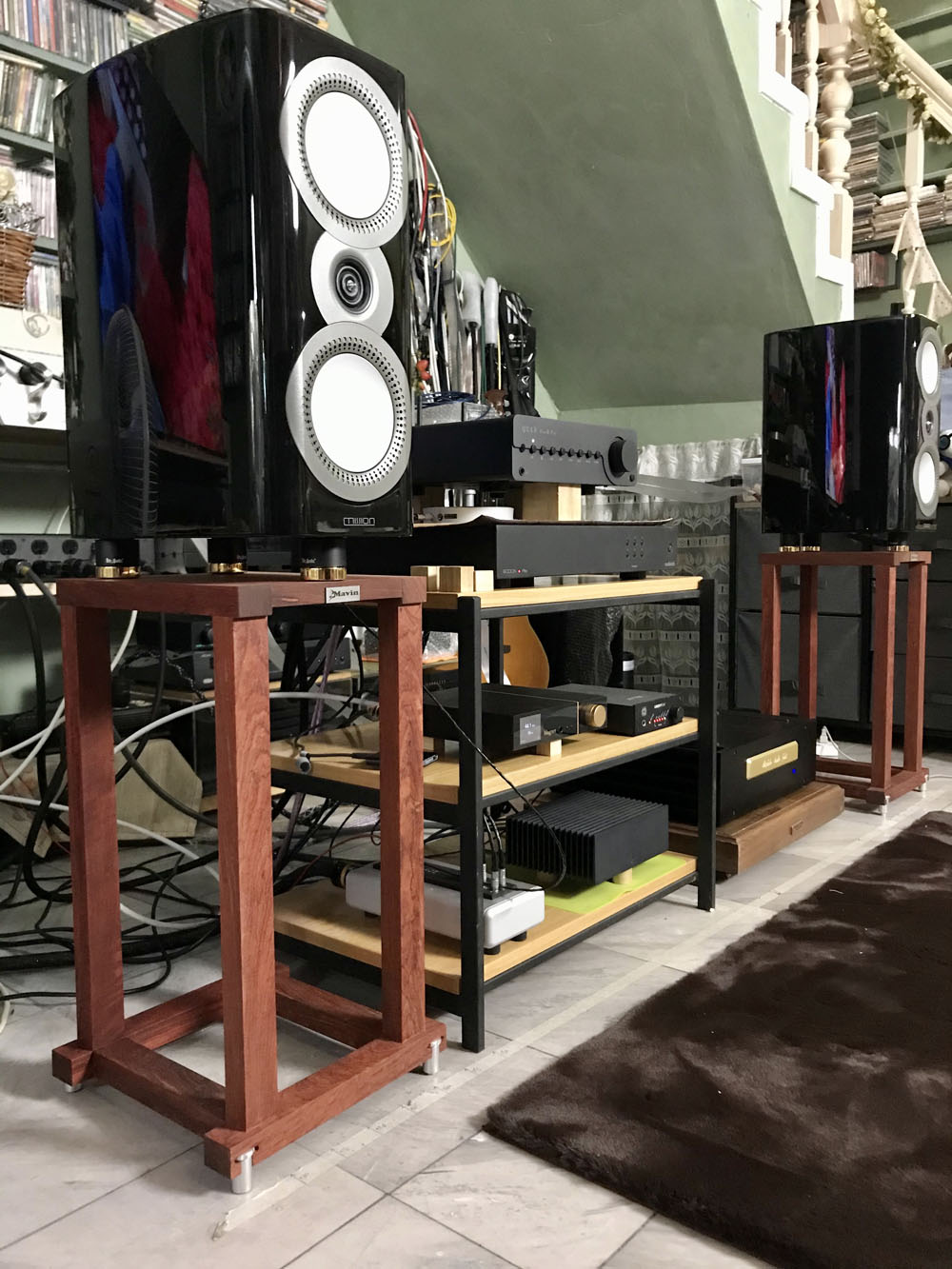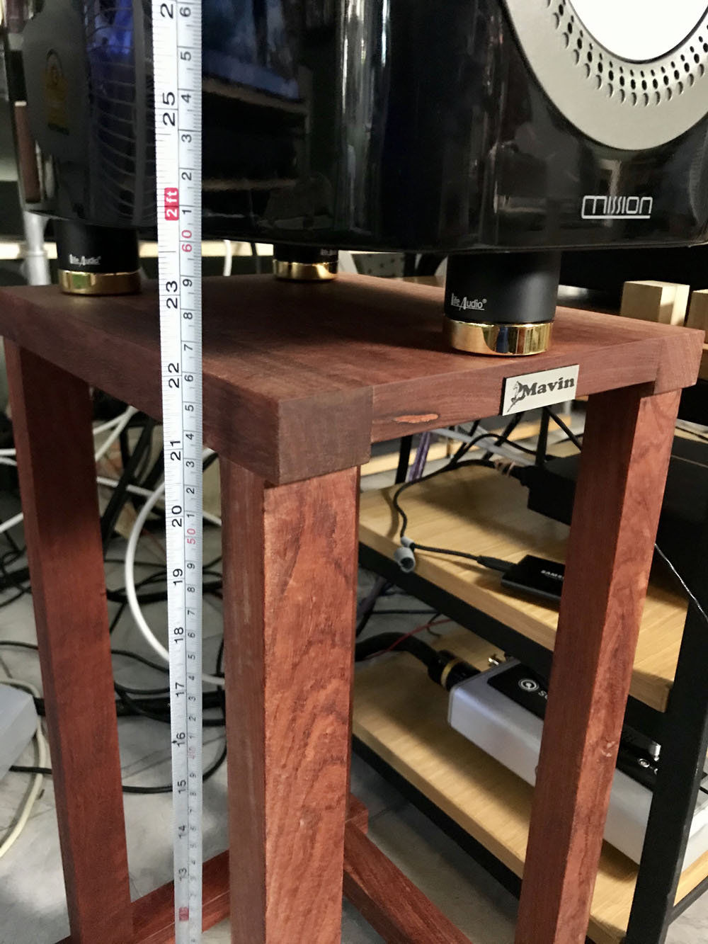 ผมทดลองเปลี่ยนลำโพงมาเป็นรุ่นที่ใหญ่ขึ้นอย่าง Mission รุ่น ZX-2 แต่เนื่องจากฐานล่างของตัวตู้ใหญ่กว่าแพลทบนของขาตั้งมาก และตัวลำโพงก็ค่อนข้างใหญ่ เมื่อวางตัว Mellow-E ลงไปทำให้ตัวลำโพงอยู่ในสภาวะไม่มั่นคง อีกทั้งความสูงยังเกินไปด้วย ซึ่งจริงๆ แล้ว ลำโพง ZX-2 ควรจะอยู่บนขาตั้งที่มีความสูงประมาณ 22 นิ้วจึงจะพอเหมาะ ผมจึงไปสั่งทำขาตั้งไม้ Mavin ที่มีความสูง 22 นิ้วมาตัวหนึ่งเพื่อใช้ทดสอบครั้งนี้ และได้ระบุให้ทางร้านทำแผ่นแพลทบนให้มีขนาดที่ใหญ่พอที่จะรองรับลำโพง ZX-2 ได้พอดีๆ (เผื่อไว้ใช้กับลำโพงคู่อื่นๆ ด้วย)