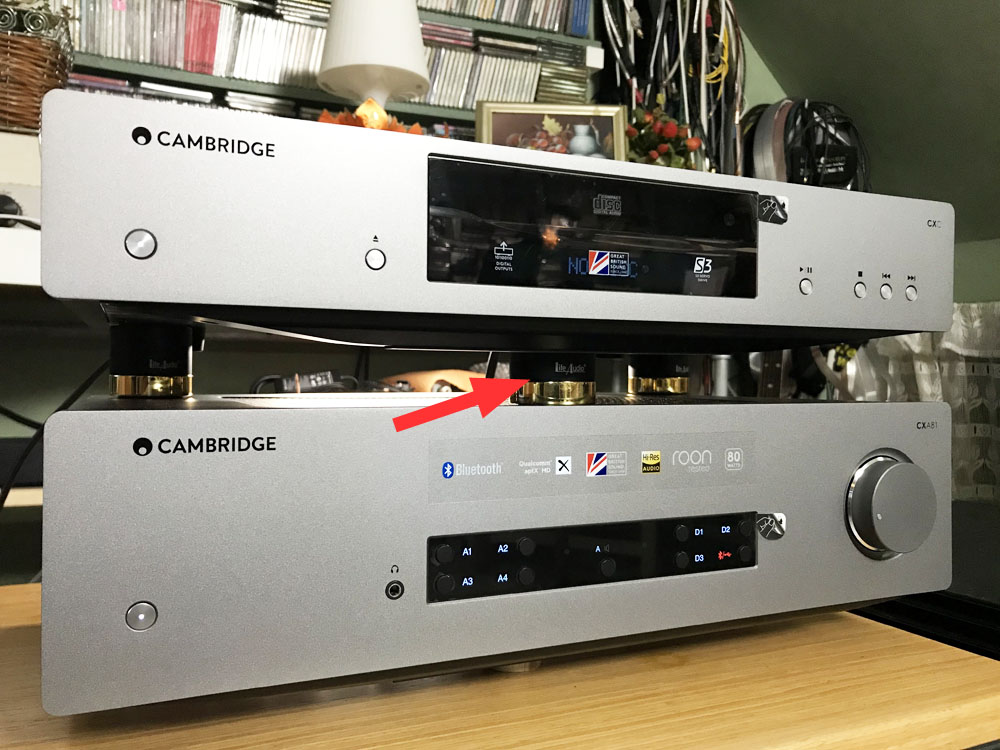 มีอีกโมเม้นต์ตอนลองฟังแล้วรู้สึกแฮ้ปปี้กับเสียงที่ได้จากการใช้งานตัวรอง Mellow-E ตัวนี้ คือผมทดลองเอา Mellow-E จำนวน 4 ตัวไปรองใต้ขาตั้งของอินติเกรตแอมป์ พบว่ามันให้ผลลัพธ์ทางเสียงโดยรวมออกมา “ดีกว่า” วางรองใต้ตัวถังเครื่องโดยตรง คือรองใต้ขาตั้งเครื่อง (เหมือนต่อขาเครื่องให้สูงขึ้น ดูจากภาพด้านบน ลูกศรสีฟ้าคือขาตั้งเครื่อง) เสียงจะเปิดโปร่ง เวทีเสียงมีความโอ่อ่ามากขึ้น ปลายเสียงสงบไม่ฟุ้ง เนื้อเสียงนวล มีมวลน่าฟัง เบสไม่หาย