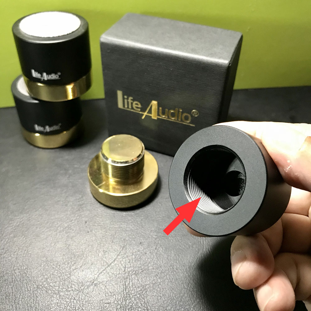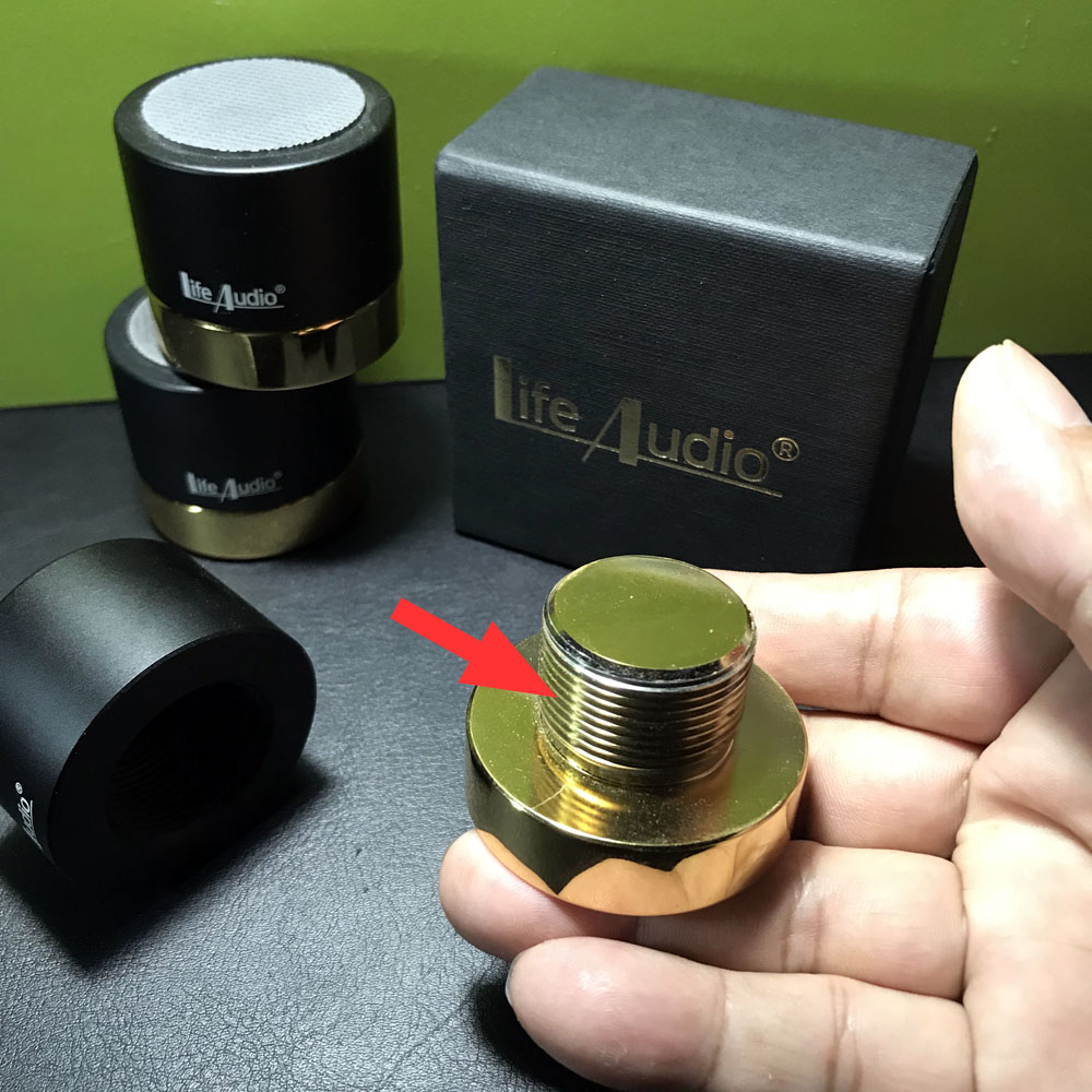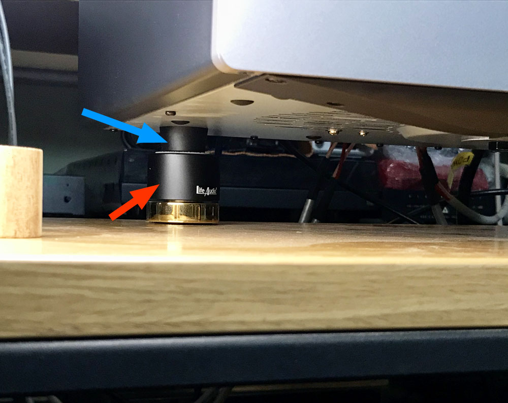 ในการวางใช้งานนั้น ทางผู้ผลิตตั้งใจให้ใช้ชิ้นส่วนที่เป็นสีทอง (ทองเหลืองชุบทอง) ทำหน้าที่เป็นฐาน คืออยู่ด้านล่าง ให้ชิ้นส่วนที่เป็นสีดำอยู่ด้านบน อย่างเช่น ถ้านำไปรองระหว่างเครื่องเสียงกับชั้นวาง ก็ให้เอาส่วนที่เป็นสีทองวางลงบนชั้นวาง โดยใช้ส่วนที่เป็นสีดำรองรับใต้ท้องเครื่อง เนื่องจากชิ้นส่วนทั้งสองชิ้นยึดติดกันด้วยเกลียว คุณจึงสามารถหมุนเกลียวเพื่อปรับระดับของตัวเครื่องให้ได้ระนาบขนานกับพื้นได้ด้วย