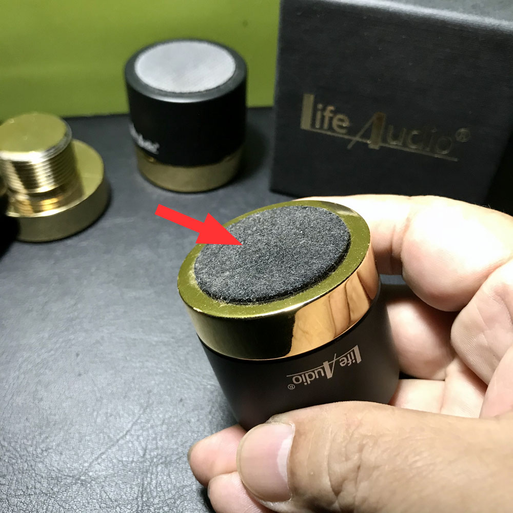 ส่วนด้านล่างของชิ้นที่เป็นสีทองก็มีแผ่นสักหลาดกลมๆ บางๆ สีเทาดำติดเอาไว้ นัยว่าช่วยเพิ่มความหนืดและซึมซับแรงสั่นสะเทือนบางส่วนเช่นกัน