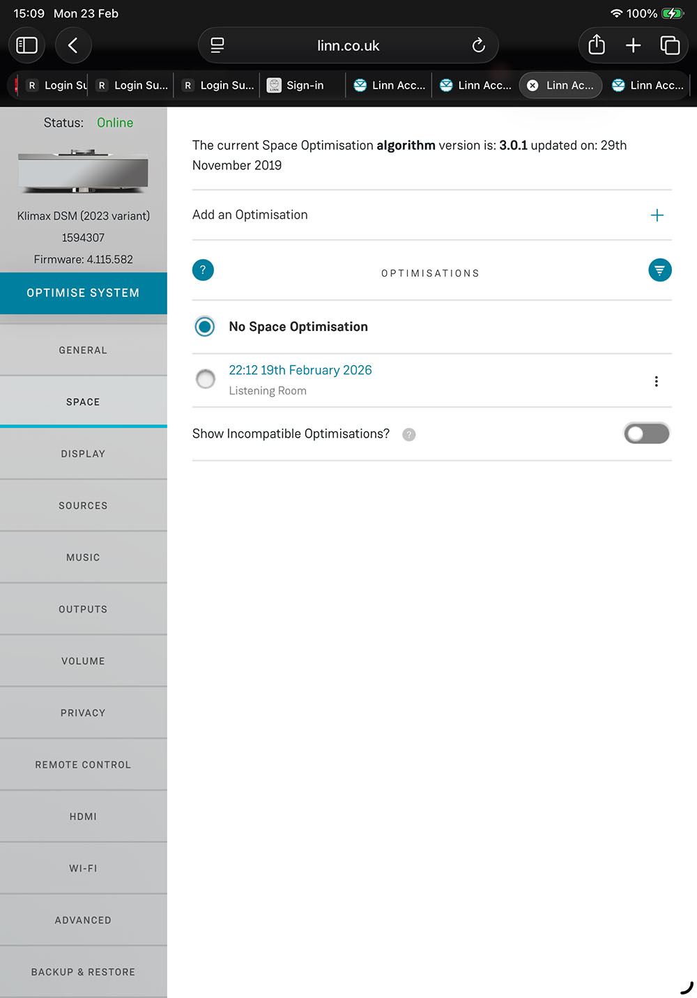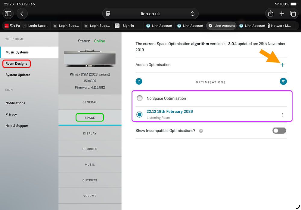 การใช้งานโปรแกรม SPACE Optimisation ตัวนี้ค่อนข้างซับซ้อนอยู่พอสมควร ใครซื้อ Klimax DSM ตัวนี้ไปและต้องการใช้งานโปรแกรม SPACE Optimisation ตัวนี้ แนะนำให้ปรึกษาทางตัวแทนจำหน่ายให้เขาเข้ามาช่วยจะดีกว่า เพราะหลังจากเลือกโปรไฟล์ลำโพงให้ตรงกับยี่ห้อ/รุ่นที่ใช้อยู่แล้ว คุณต้องเข้าไปกำหนดสเปคฯ ของห้องฟังที่หัวข้อเมนูที่ชื่อว่า ‘Room Designs’ (วงรีสีแดง ในรูปข้างบน) ซึ่งอยู่ในเมนู Manage System โดยกระทำผ่าน LINN account ซึ่งคุณต้องเข้าไปตั้งบนเว็บไซต์ของ LINN บนอินเตอร์เน็ต จากนั้นก็เข้าไปที่หัวข้อ ‘SPACE’ (วงรีสีเขียว) แล้วจิ้มลงไปที่เครื่องหมายบวก (ศรชี้สีส้ม) เพื่อให้โปรแกรมทำการสร้างค่า optimise ขึ้นมาให้ เมื่อโปรแกรมคำนวนค่า optimise ตามข้อมูลที่เรากรอกลงไปในโปรแกรมที่หัวข้อ Room Designs หลังจากโปรแกรมคำนวนเสร็จแล้ว จะปรากฏโปรไฟล์ที่เราทำไว้ขึ้นมาในกรอบสีม่วง (ภาพข้างบน) แค่นี้ก็เสร็จแล้ว ถ้าต้องการฟังเสียงของซิสเต็มแบบที่มีโปรไฟล์ Optimise ที่โปรแกรม SPACE Optimisation คำนวนมาให้ ก็คลิ๊กที่วงกลมหน้าโปรไฟล์ที่เราสร้างไว้ (ของที่ผมทดลองทำไว้ในภาพก็คือ “22:12 19th February 2026”) เราจะได้เสียงออกมาแบบหนึ่งที่ต่างจากเสียงที่ไม่ได้ใช้ฟังท์ชั่น SPACE Optimisation (ตรงหัวข้อ No Space Optimisation) ชอบแบบไหนก็เลือกฟังแบบนั้น