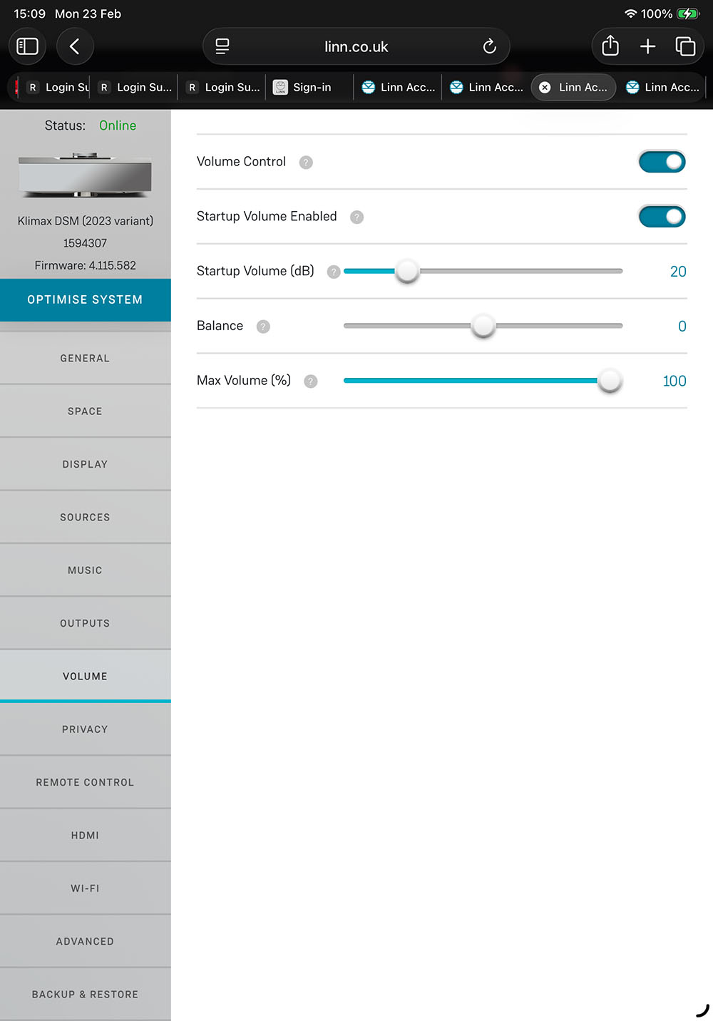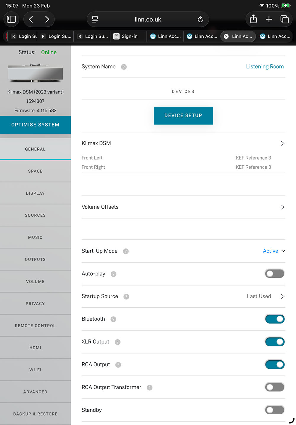 หลังจากทดสอบเงื่อนไขแรกเสร็จ ผมก็เปลี่ยนแอมป์กับลำโพงเพื่อให้ Klimax DSM ทำหน้าที่เป็นทั้งสตรีมเมอร์และปรีแอมป์โดยเข้าไปสั่งเปิดใช้ระบบวอลลุ่มของ Klimax DSM บนเว็บคอนโทรล ส่วนทางด้านแอมป์กับลำโพง ผมก็เปลี่ยนมาใช้เพาเวอร์แอมป์โมโนบล็อกของ LINN รุ่น Klimax Solo 500 เข้ามาทำหน้าที่ขับลำโพง KEF รุ่น Reference 3 Meta (REVIEW) ที่ผมยกเข้าไปแทน Classic 8 เพื่อให้สมรรถนะของลำโพงสูสีกับแอมป์และสตรีมเมอร์มากขึ้น ส่วนการปรับระดับความดังผมควบคุมผ่านระบบวอลลุ่มในตัว Klimax DSM