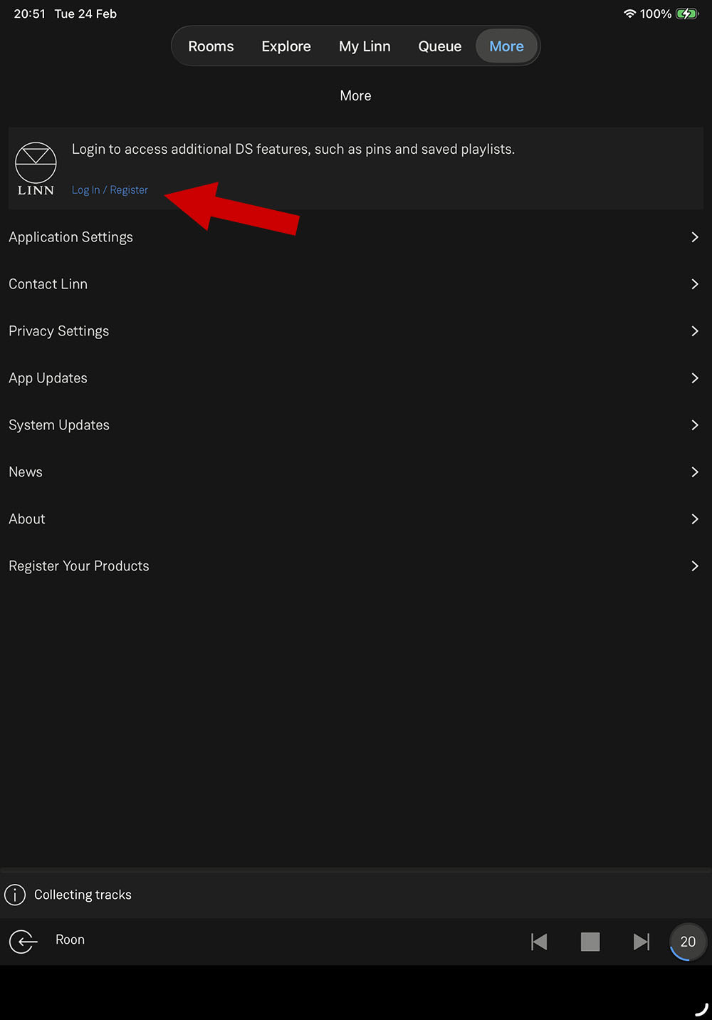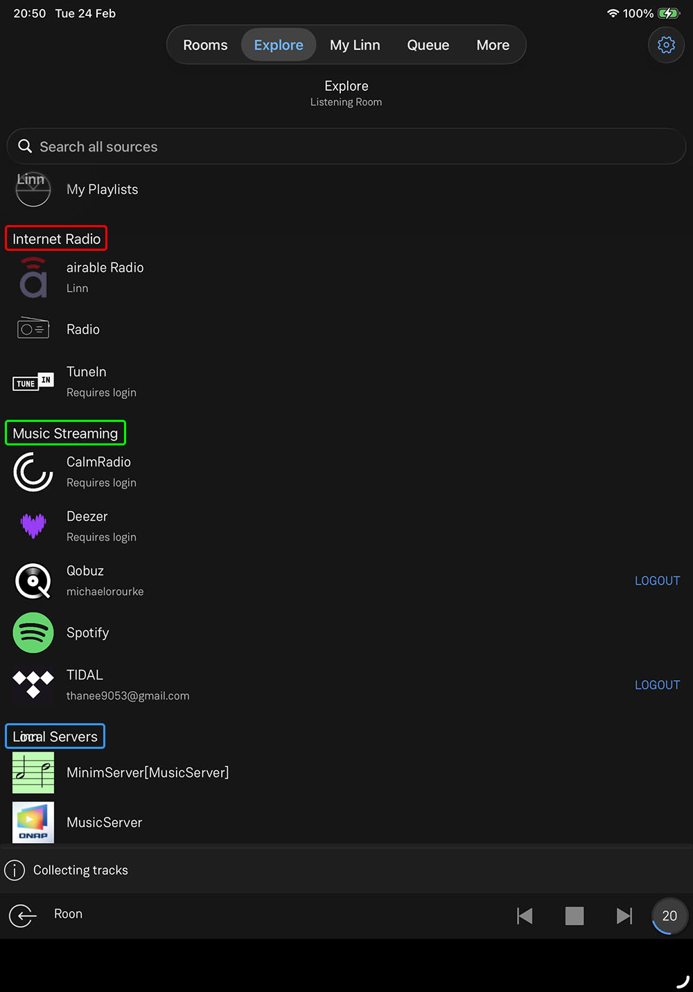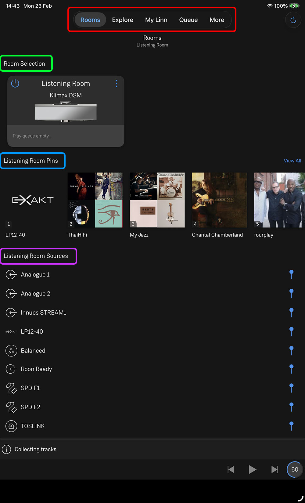 ภาพข้างบนเป็นหน้าตาของแอพฯ LINN ที่พวกเขาออกแบบมาไว้ให้ใช้เล่นไฟล์เพลง โดยแยกการทำงานทั้งหมดออกเป็น 5 หัวข้อหลัก (กรอบสีแดง) ได้แก่ Rooms, Explore, My Linn, Queue และ More โดยที่หน้าแรกของแอพฯ ก็คือหน้า Rooms ตามภาพข้างบน