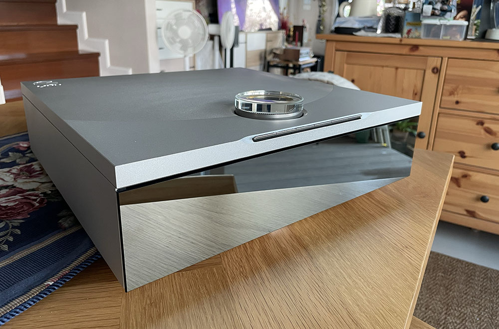 ความตั้งใจของ LINN แสดงออกมาให้เห็นอย่างชัดเจนตั้งแต่รูปร่างหน้าตาภายนอกที่สวยสะดุดตาด้วยดีไซน์เรียบหรูที่ตั้งอยู่บนพื้นฐานที่เรียบง่ายแต่รับรู้ได้ถึงความปราณีตระดับขีดสุด ตัวถังทรงสี่เหลี่ยมจัตุรัสที่มีความหนาเกือบยี่สิบเซ็นติเมตร ถูกกัดกลึงขึ้นมาจากแท่งอะลูมิเนียมตันๆ ผ่านการขัดเกลาจนราบเรียบ อะโนไดซ์ผิวนอกเป็นสีเงินหรือสีดำให้เลือก แผงหน้าปิดทับด้วยกระจกเกือบเต็มพื้นที่ ทับอยู่บนจอภาพขนาดใหญ่ที่ซ่อนตัวอยู่ด้านล่าง..