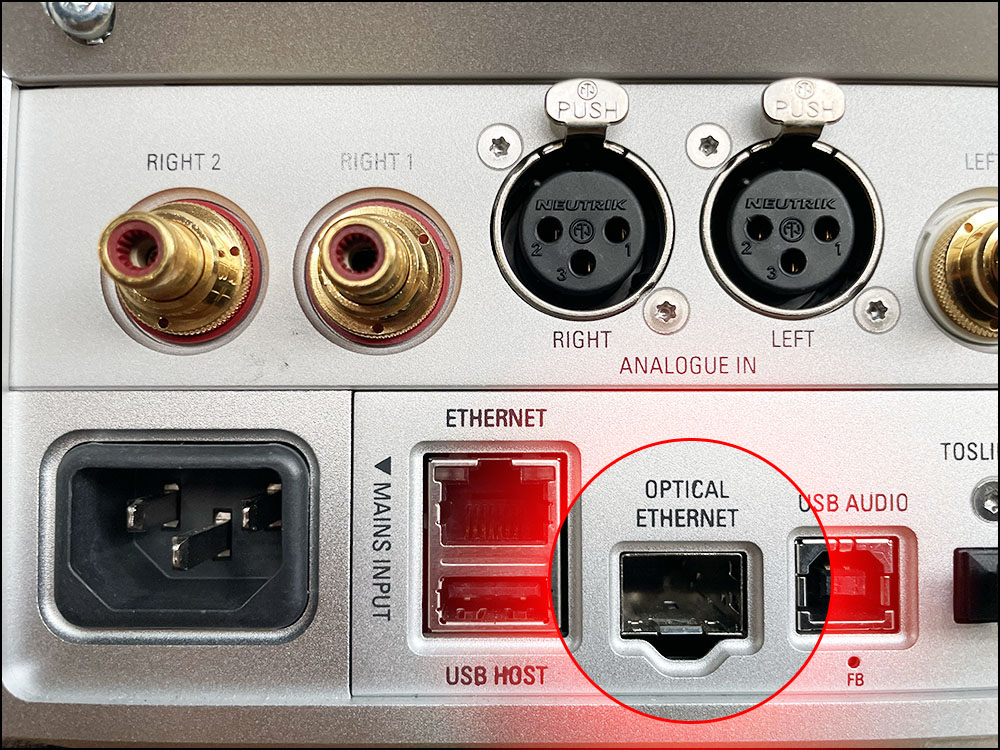 ภาพข้างบนนั้นคือ ช่องอินพุตสำหรับสัญญาณ optical network (วงกลมสีแดง) ที่อยู่บนแผงหลังของ Klimax DSM ซึ่ง LINN เรียกว่าช่อง “Optical Ethernet”