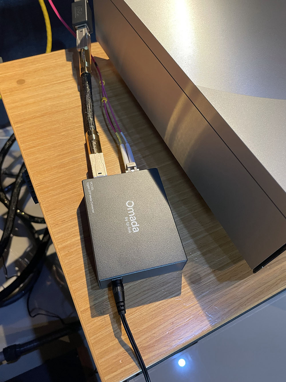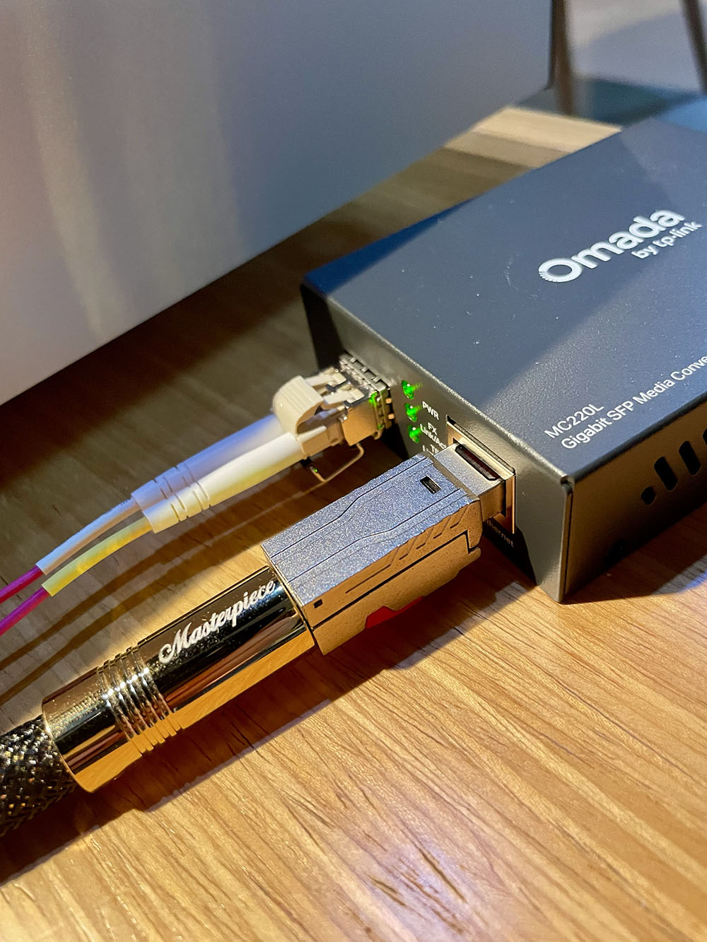 การเชื่อมต่ออ๊อปติคัล เน็ทเวิร์คไม่ยาก แค่ต้องมีอุปกรณ์ที่จำเป็นต้องใช้ 3 อย่าง ได้แก่ กล่องแปลง media converter, โมดูล SFP และสายไฟเบอร์ อ๊อฟติค ซึ่งทั้งหมดนั้น ผมใช้วิธีสั่งซื้อจากออนไลน์ทุกชิ้น ตัวกล่องแปลง media converter เป็นของยี่ห้อ Omada ซึ่งเป็นผลิตภัณฑ์ของ TP-Link รุ่น MC 220L กับโมดูล SFP รุ่น SM311LM ก็แบรนด์ Omada ชิ้นที่สามคือสายไฟเบอร์ อ๊อฟติคผมลองสั่งสายไฟเบอร์ อ๊อฟติค มาตรฐาน OM4 (optical multimode level 4) ของแบรนด์ Hoolnx ยาว 2 เมตร มาทดลองใช้ ส่วนการเชื่อมต่อระบบก็ไม่มีอะไรซับซ้อน (*ดูตามชาร์ตข้างบน)