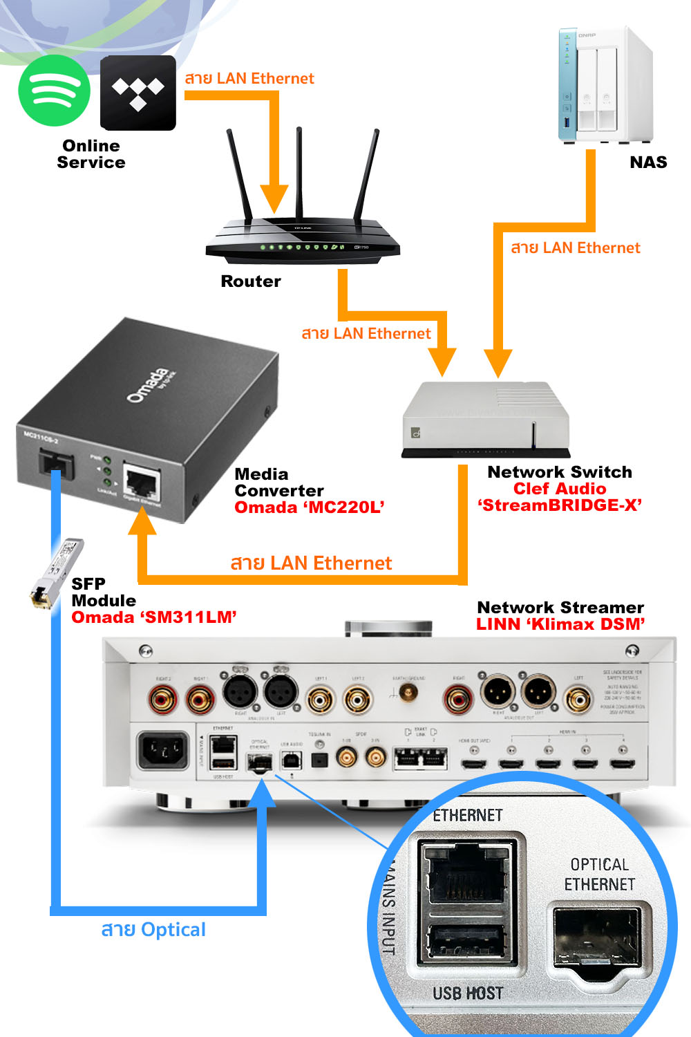 ปัจจุบัน เทรนด์ของการนำเอาระบบการเชื่อมต่อสัญญาณเน็ทเวิร์คด้วย “แสง” (Optical Network) เข้ามาใช้กับระบบมิวสิค สตรีมมิ่ง ที่ใช้อยู่ในชุดเครื่องเสียงเริ่มแพร่หลายมากขึ้น ก่อนหน้านี้จะจำกัดอยู่เฉพาะกลุ่มเล็กๆ เนื่องจากอุปกรณ์ที่ใช้ในการเชื่อมต่อล้วนแต่อยู่ในกลุ่ม network IT ทั้งนั้น ไม่ว่าจะเป็นกล่อง media converter ที่ใช้ในการแปลงไฟฟ้าให้เป็นแสง ส่วนผลิตภัณฑ์ที่เป็นอุปกรณ์เครื่องเสียงที่รองรับกับการเชื่อมต่อด้วยแสงลักษณะนี้ยังมีออกมาไม่มาก ซึ่งหนึ่งในจำนวนน้อยนิดนั้นก็มี Klimax DSM ตัวนี้รวมอยู่ในนั้นด้วย.!