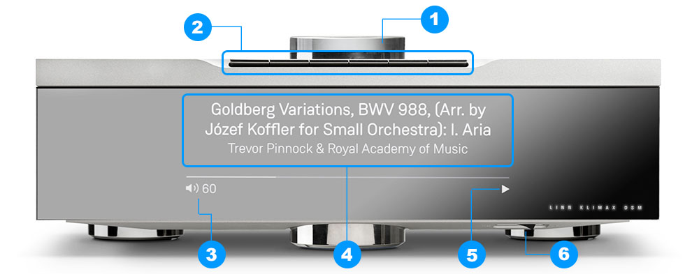 หน้าจอของ Klimax DSM เป็นดีสเพลย์ TFT ที่มีความละเอียดอยู่ที่ 1600×480 pixel จะแสดงรายละเอียดต่างๆ ขึ้นมาให้ดูแค่ช่วงเวลาสั้นๆ แล้วก็ปิดลง นัยว่าน่าจะเกี่ยวกับเรื่องคุณภาพเสียงนั่นเอง ฮาร์ดสวิทช์ที่ใช้เปิด/ปิดเครื่องถูกซ่อนไว้ใต้ตัวถังใกล้ๆ กับแผงหน้า ต้องใช้ปลายนิ้วล้วงเข้าไปกดเปิด/ปิดเครื่อง