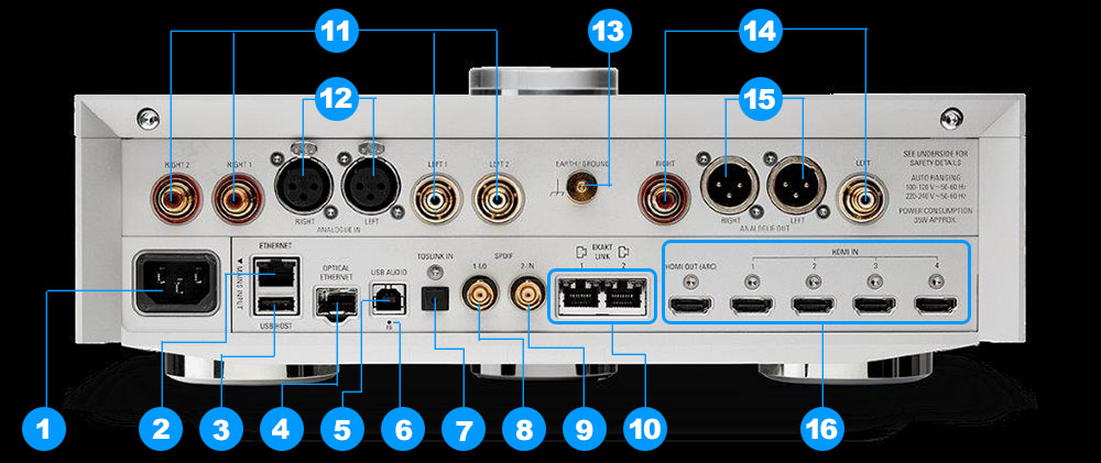 ตัวที่ผมได้รับมาทดสอบเป็นเวอร์ชั่น AV variant ซึ่งเป็นเวอร์ชั่นที่ติดตั้งทุกอย่างมาให้แบบฟูลอ็อปชั่น บนแผงหลังจึงเต็มไปด้วยข้อต่อสัญญาณอินพุต/เอ๊าต์พุตแน่นพรืดตามที่เห็นข้างต้น คุณจึงสามารถใช้งาน Klimax DSM ตัวนี้ได้ทั้งในชุดฟังเพลง 2 แชนเนลอย่างเดียว หรือจะใช้ในซิสเต็มที่เซ็ตอัพเป็นระบบเสียงมัลติแชนเนลร่วมกับการดูหนังก็ได้
