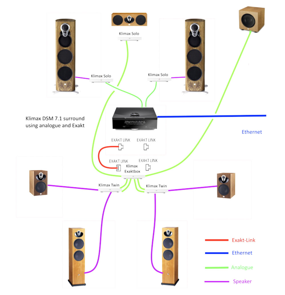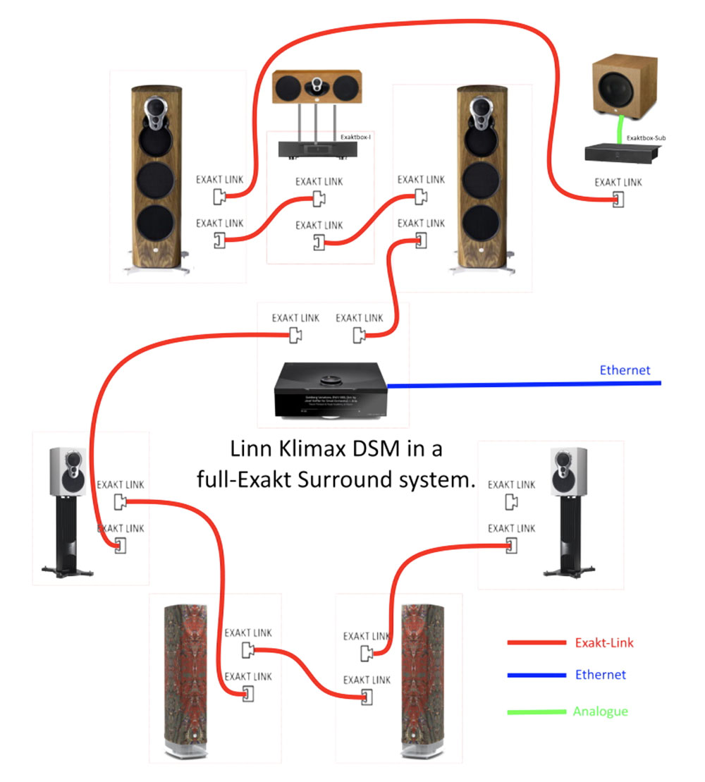 ข้อมูลในคู่มือแสดงชาร์ตการเชื่อมต่อ Klimax DSM ด้วยระบบเสียงมัลติแชนเนลว่าสามารถทำได้ 2 แนวทาง ตามภาพข้างบนนั้น เป็นการใช้งานร่วมกับชุดลำโพง active ของ LINN เอง โดยอาศัยสัญญาณเอ๊าต์พุตของ Klimax DSM จากช่อง EXAKT LINK ที่ส่งผ่านด้วยสาย LAN