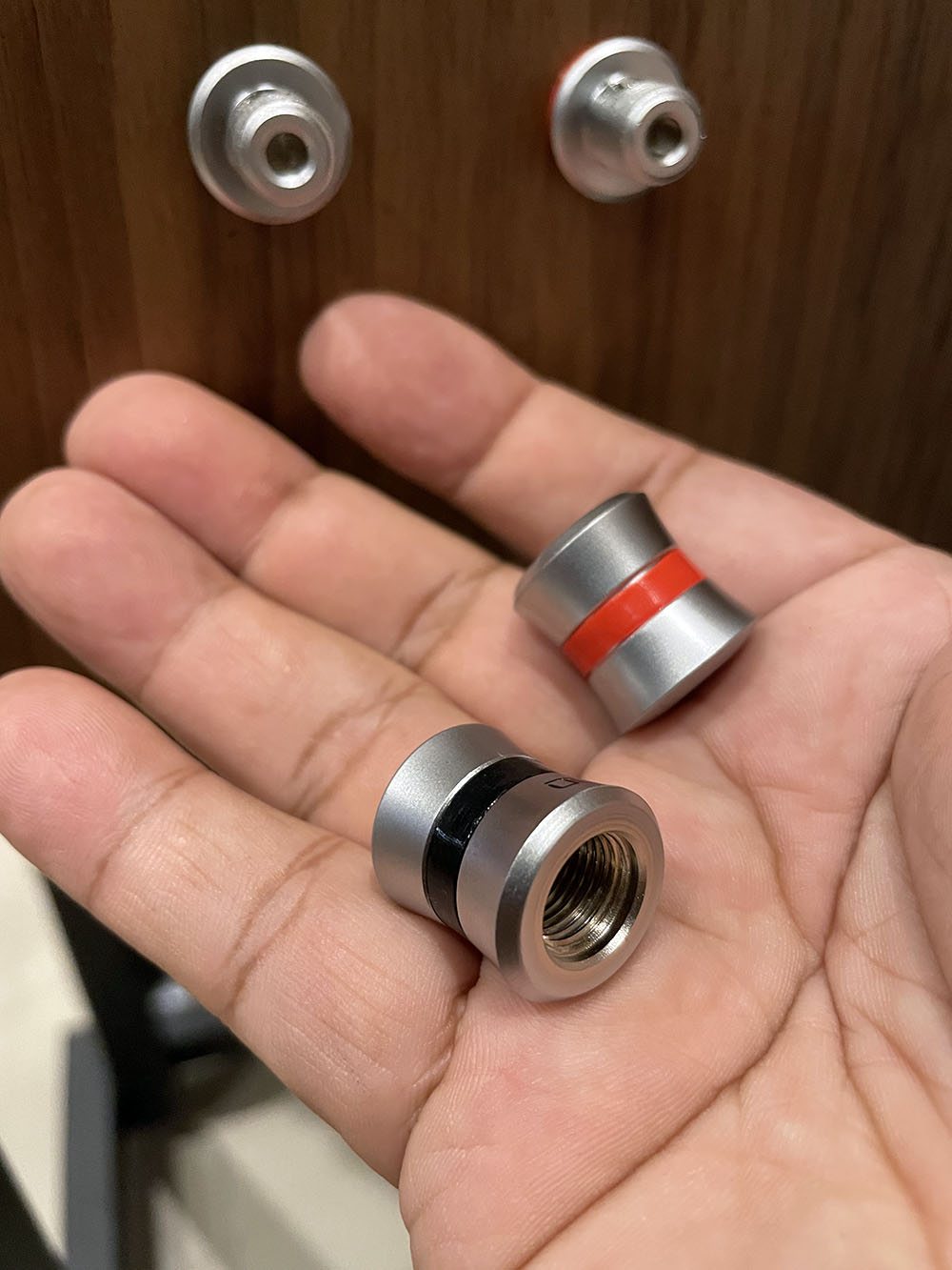 อย่างแรกคือ จานรองเดือยแหลมของขาตั้งลำโพงซึ่งทำมาจากโลหะ ทำเป็นเหรียญกลมๆ ที่มีเส้นผ่าศูนย์กลาง 3 .. และมีแผ่นสักหลาดติดอยู่ด้านล่าง ช่วยเพิ่มความนุ่มเมื่อสัมผัสกับพื้นห้องที่มีความแข็งอย่างเช่น พื้นไม้ หรือพื้นปูน ซึ่งผมชอบมากเพราะที่ห้องผมเป็นพื้นไม้ พอใช้จานรองตัวนี้ทำให้ผมสามารถเลื่อนขยับตำแหน่งลำโพงได้ง่ายขึ้น แค่ใช้มือผลักขาตั้งก็สามารถเลื่อนตำแหน่งลำโพงได้แล้ว ไม่ต้องยกลำโพงขึ้นมาจากพื้น จึงจูนตำแหน่งได้ละเอียด