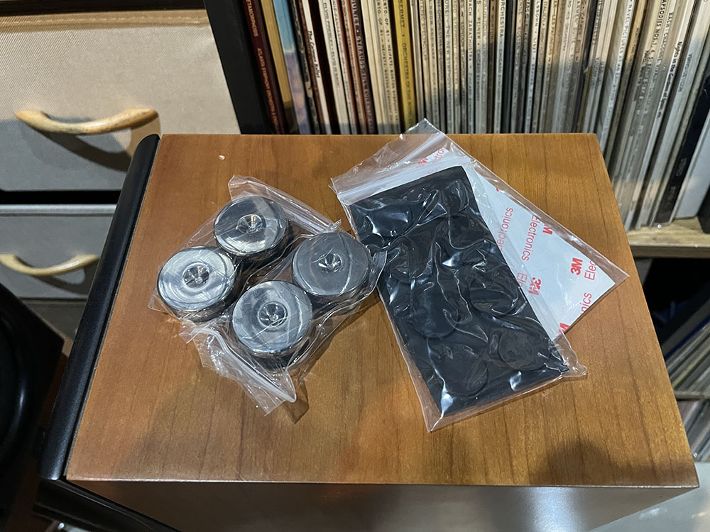 ถุงดำๆ ที่วางอยู่ข้างๆ จานรองเดือยแหลมก็คือแผ่นยางแข็งที่ให้มาใช้ติดที่มุมด้านล่างใต้ฐานของลำโพงแต่ละข้าง ข้างละ 4 ชิ้น เพื่อยกลำโพงให้ลอยจากแพลทของขาตั้งขึ้นมา (หนาประมาณ 3-4 ..)