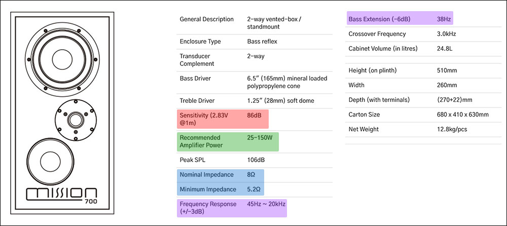 ลำโพงรุ่นนี้ระบุกำลังขับที่แนะนำไว้ระหว่าง 25 – 150 วัตต์ต่อข้าง (แถบเขียว) ขณะที่ความไวอยู่ที่ 86dB (แถบแดง) ซึ่งถือว่าอยู่ในเกณฑ์ที่ค่อนข้างต่ำ ดังนั้น ถ้าจะให้ชัวร์ว่าขับได้เต็มทั้งเพลงฟังและเพลงโชว์ ขับได้สุดทุกแนว และใช้ในห้องที่มีขนาดใหญ่ (ตั้งแต่ 4×6 ตรม. ขึ้นไป) แนะนำให้เลือกแอมป์ที่มีกำลังขับสูงหน่อย ระหว่าง 75% – 100% ของกำลังขับสูงสุดที่ผู้ผลิตลำโพงแนะนำคือ 112.5 (150 x 75/100) ถึง 150 วัตต์ ถ้านำไปใช้ในห้องที่มีขนาดปานกลางลงไปถึงห้องเล็กๆ (ตั้งแต่ 4×6 ลงไป) แอมป์ที่มีกำลังขับปานกลางระหว่าง 75 – 100 วัตต์ ก็น่าจะเอาอยู่ เพราะอิมพีแดนซ์ของ Mission 700 ระบุไว้ที่ 8 โอห์ม และสวิงลงไปไม่ถึงครึ่ง แค่ 5.2 โอห์ม (แถบฟ้า) เลยไม่โหดมาก