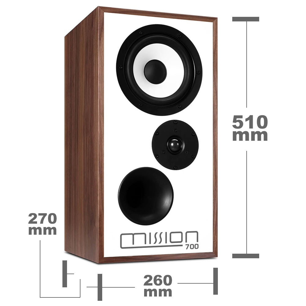 Mission 700 เวอร์ชั่น 2022 มีขนาดตัวตู้ที่ใหญ่กว่าลำโพงสองทางมาตรฐานทั่วไป แม้ว่าไดเวอร์มิด/วูฟเฟอร์ที่ใช้ขับเสียงกลางต่ำจะมีขนาดเส้นผ่าศูนย์กลาง 6.5 นิ้ว เหมือนกับลำโพงสองทางวางหิ้งส่วนใหญ่ทั่วไป แต่ตัวตู้ของ Mission 700 จะมี ความสูงมากกว่าลำโพงสองทางวางหิ้งทั่วไปเกือบๆ สองเท่า ในขณะที่แผงหน้าและความลึกใกล้เคียงกัน