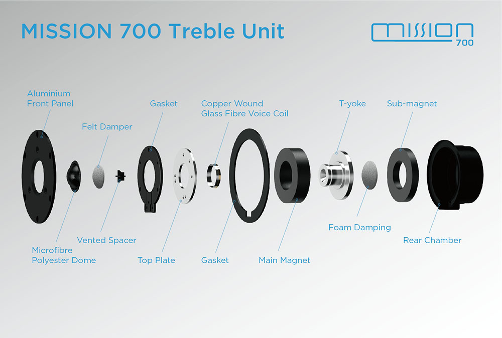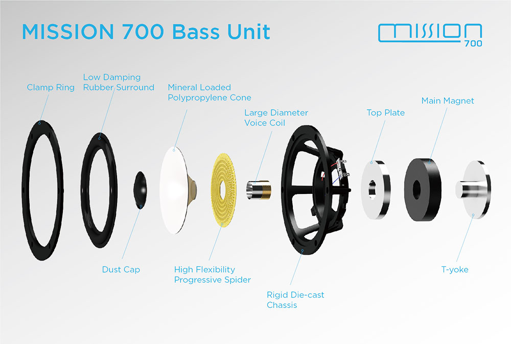 ในเว็บไซต์ของผู้ผลิตให้ข้อมูลไว้ว่า ไดอะแฟรมของไดเวอร์มิด/วูฟเฟอร์ที่ใช้ขับเสียงกลางแหลมของ Mission 700 ทำมาจากวัสดุโพลีโพรไพลีนผสมผงแร่ที่ปรับจูนมาเพื่อเจตนาให้ได้ คุณภาพของเสียงในแต่ละด้าน คือ เสียงทุ้มที่มีรายละเอียด, ถ่ายทอดความถี่เสียงโดยปราศจากสีสัน, ถ่ายทอดไดนามิกทรานเชี้ยนต์ที่ฉับไวและรุนแรง, ถ่ายทอดมิติด้านลึกที่ไล่เรียงเป็นชั้น และถ่ายทอดสปีดที่ถูกต้องแม่นยำ ผสมผสานไปกับ ความเป็นดนตรีที่ลงตัวมากที่สุด