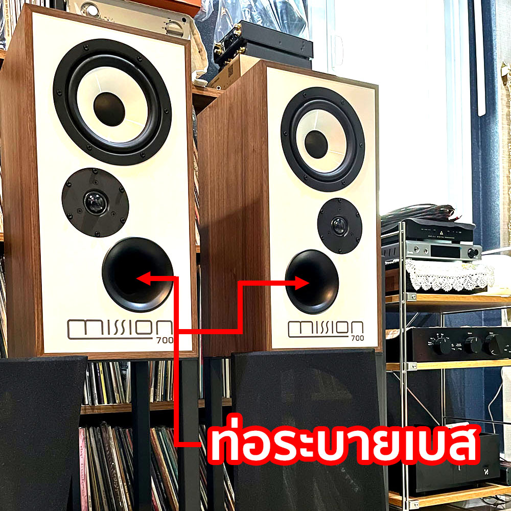 Mission 700 เจาะท่อระบายเบสยิงออกทางด้านหน้า ซึ่งมีความหมายสองนัยยะ โดยทั่วไปจะเข้าใจว่าสามารถวางลำโพงชิดผนังหลังได้มากกว่าแบบท่อยิงออกด้านหลัง แต่กรณีของ Mission 700 มีประเด็นที่แตกต่างจากลำโพงเล็กทั่วไป คือเหตุผลที่ผู้ผลิต Mission 700 ติดตั้งท่อระบายเบสให้ยิงออกทางด้านหน้านั้น อาจจะเป็นเพราะพวกเขา ไม่ต้องการผนังหลังเข้ามาช่วยปั๊มเสียงทุ้มก็เป็นได้..